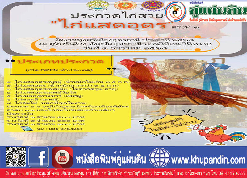 มาเบิ่งไก่เด้อจร้า !!! 1 ธ.ค. 2568 ชมประกวดไก่สวยงาม “ไก่แสดอุดร” ครั้งที่ 1