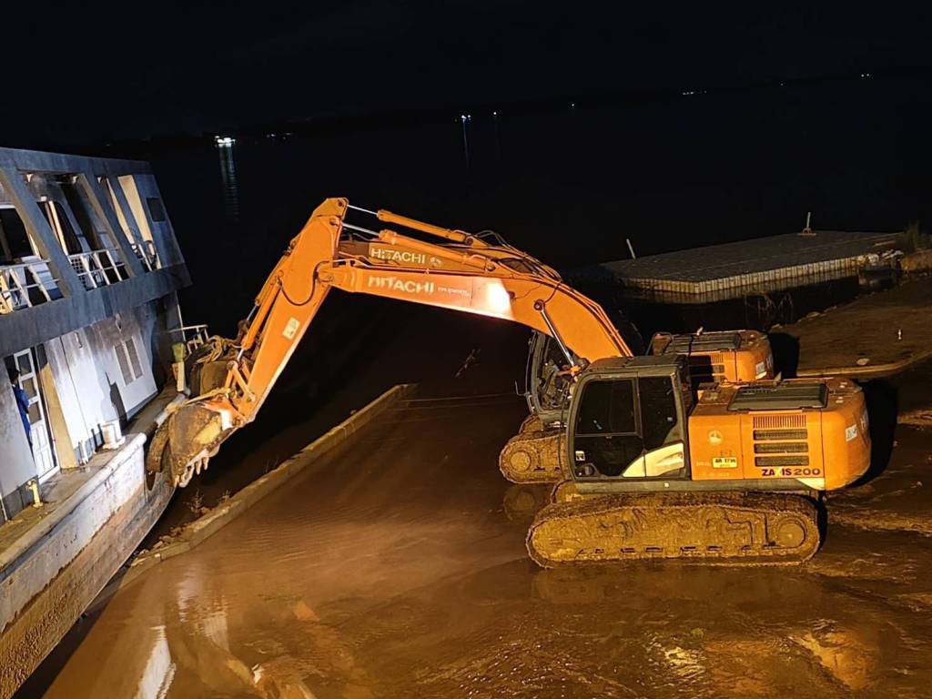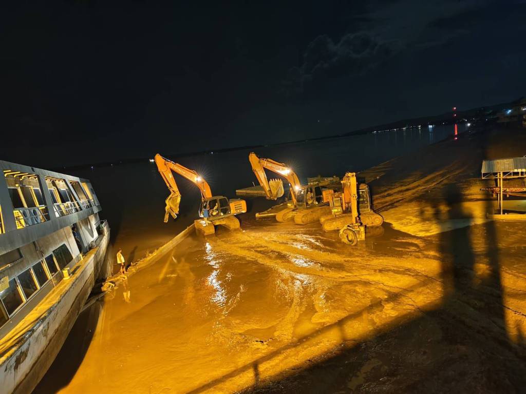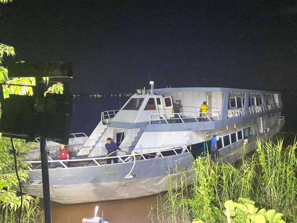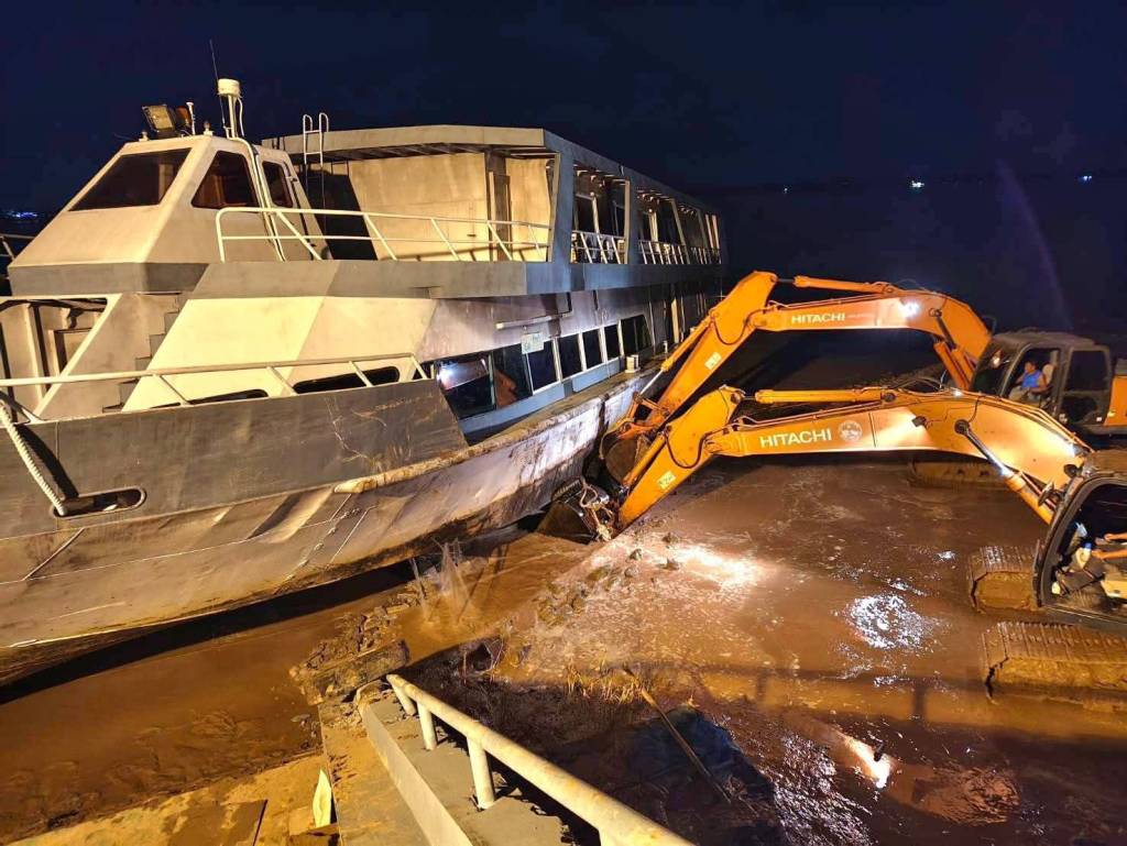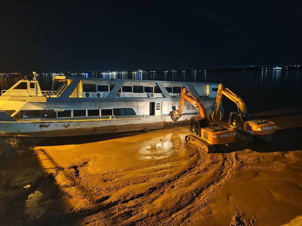 มุกดาหาร -ปฏิบัติการกลางดึกริมโขง! นายกเทศมนตรีเมืองมุกดาหารประสานเลขานายก อบจ. ส่งแบคโฮ 3 คัน ผลักดันเรือมุกดาหารปริ้นท์เซสที่เกยตื้น จนลอยกลับลงแม่น้ำโขงได้สำเร็จ