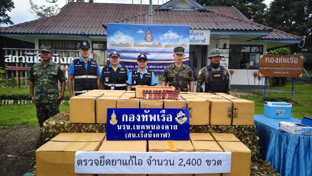วันที่ 22 ส.ค.โดยการอำนวยการของ พล.ร.ต.ณรงค์ เอมดี ผบ.นรข. และ น.อ.วิศิษฐ์พงศ์ เจริญวิชยเดช ผบ.นรข.เขตหนองคาย สั่งการให้ น.ท.รุ่งเรือง มาสุทธิ หน.สน.เรือบึงกาฬ ประสานกำลังฝ่ายความมั่นคงโดยมี พ.ต.อ.จตุพร เนวะมาตย์ ผกก.ตม.บึงกาฬ ร.ต.อ.สมพงษ์ พบวันดี รอง ผบ.ร้อย ตชด.244 น.ส.เบญจ์ ชำกรม หน.ฝ่ายสืบสวนและปราบปราม พร้อมด้วยกำลังฝายปราบปรามตรวจสอบเรือหาปลาที่จอดอยู่รมน้ำโขง บ้านท่าไคร้ ต.บึงกาฬ อ.เมืองบึงกาฬ จ.บึงกาฬ ถึงที่เกิดเหตุพบกลุ่มคนต้องสงสัย กำลังลำเลียงลังกล่องกระดาษวางลงบนเรือหาปลา บางส่วนก็วางอยู่บนพื้นทางเดิน จึงแสดงตัวตรวจค้น แต่กลุ่มผู้ต้องสงสัยก็พากันแตกตื่นวิ่งหลบหนีไปกับความมืด ด้วยความชำนาญเส้นทาง จนท.จึงนำกล่องกระดาษดังกล่าวไปตรวจดุสิ่งของในกล่องอีกครั้งที่ สน.เรือบึงกาฬ เพื่อตรวจสอบโดยละเอียด พบว่าเป็นยาแก้ไอน้ำเชื่อมยี่ห้อหนึ่ง เมื่อ พ.ต.ท.ลอย สัพพโส รอง ผกก.พฐ.บึงกาฬ นำน้ำยามาทดสอบพบว่าเป็นยาเสพติดประเภท 3 จะได้ออกหมายจับผู้เป็นเจ้าของมาดำเนินคดีตาม กม.โดยกล่าวหา ร่วมกันมียาเสพติดให้โทษประเภท3 (ตำหรับยาแก้ไอชนิดน้ำผสม โคเดอีน) ไว้ในครอบครองเพื่อจำหน่าย โดยเป็นการกระทำเพื่อการค้า ก่อให้เกิดการแพร่กระจายในกลุ่มประชาชน และเป็นการกระทำให้เกิดผลกระทบต่อความมั่นคงของรัฐ หรือความปลอดภัยของประชาชนทั่วไป (ตำหรับยาแก้ไอชนิดน้ำเชื่อมผสม โคเดอีน) บรรจุขวด จำนวน 12 ลังๆ ละ 200 ขวด รวม 2,400 ขวด จึงจะได้แจ้งข้อหามาเจ้าของดำเนินคดีต่อไป และทำบันทึกตรวจยึดและนำของกลางส่ง สภ.เมืองบึงกาฬ เพื่อดำเนินคดีตามกฎหมายต่อไป.