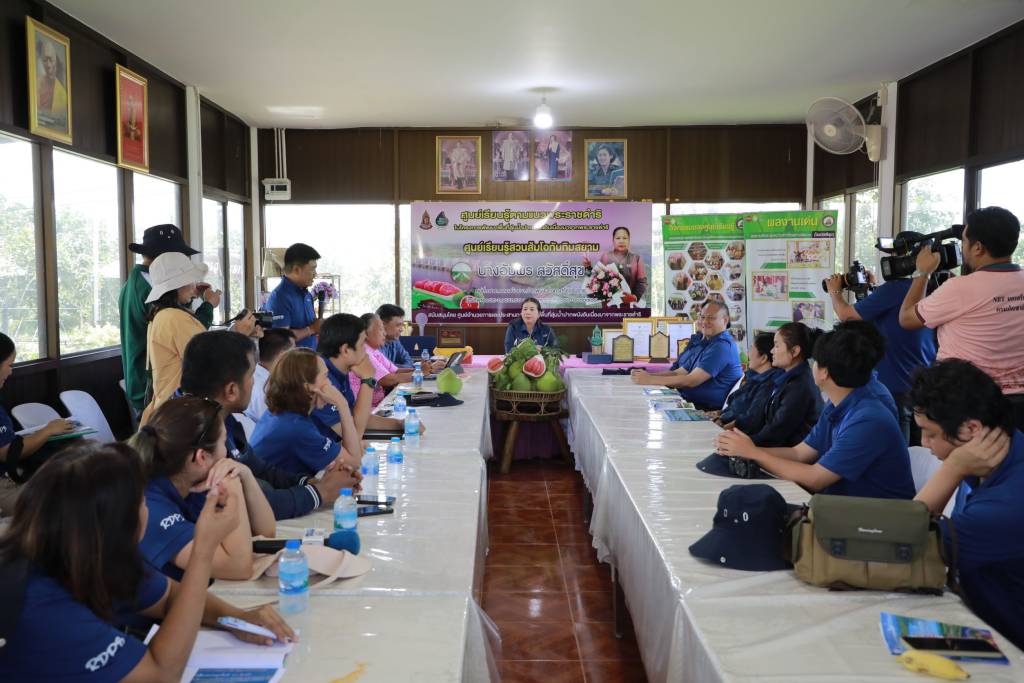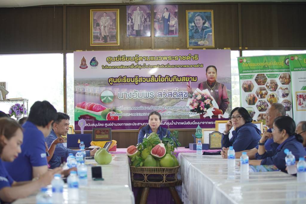 ในช่วงบ่ายคณะสื่อมวลชนได้เดินทางไปยังสวนส้มโอทับทิมสยาม (ไร่สวัสดิ์สุข) ของนางอัมพร สวัสดิ์สุข ซึ่งเป็นศูนย์เรียนรู้ตามแนวพระราชดำริของโครงการพัฒนาพื้นที่ลุ่มน้ำปากพนังฯ ผู้ปลูกปั้นส้มโอทับทิมสยามให้เป็นรู้จัก ศูนย์เรียนรู้แห่งนี้มีกิจกรรมหลากหลาย อาทิ การขยายพันธุ์ส้มโอทับทิมสยาม การแปรรูปผลผลิตจากส้มโอทับทิมสยาม แนวทางและวิธีการดูแลแปลงส้มโอทับทิมสยาม ตลอดถึงการเก็บเกี่ยวผลผลิตเพื่อส่งจำหน่าย นอกจากนี้ยังพัฒนาต่อยอดเป็นแหล่งท่องเที่ยวเชิงเกษตรอีกด้วย