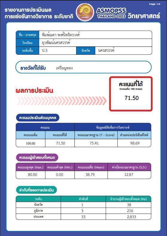 วันที่ 12 กันยายน 2568 นายเฉลิม รอดหลง ติวเตอร์วิชาวิทยาศาสตร์ เปิดเผยว่า "น้อง ไอริณ" เด็กหญิงพิมพ์ณดา พงศ์ไพจิตวงศ์ นักเรียนชั้น ป 3 โรงเรียนยุวพัฒน์นครสวรรค์ สมัครสอบแข่งขันทางวิชาการระดับชาติ ASMOPSS Thailand ในวิชา วิทยาศาสตร์ ผลการสอบปรากฏว่า ได้ลำดับที่ 1 ของจังหวัดนครสวรรค์ ลำดับที่ 3 ของภูมิภาคและระดับที่ 33 ของระดับประเทศโดยมีคนสอบทั้งหมด 2,833 คน