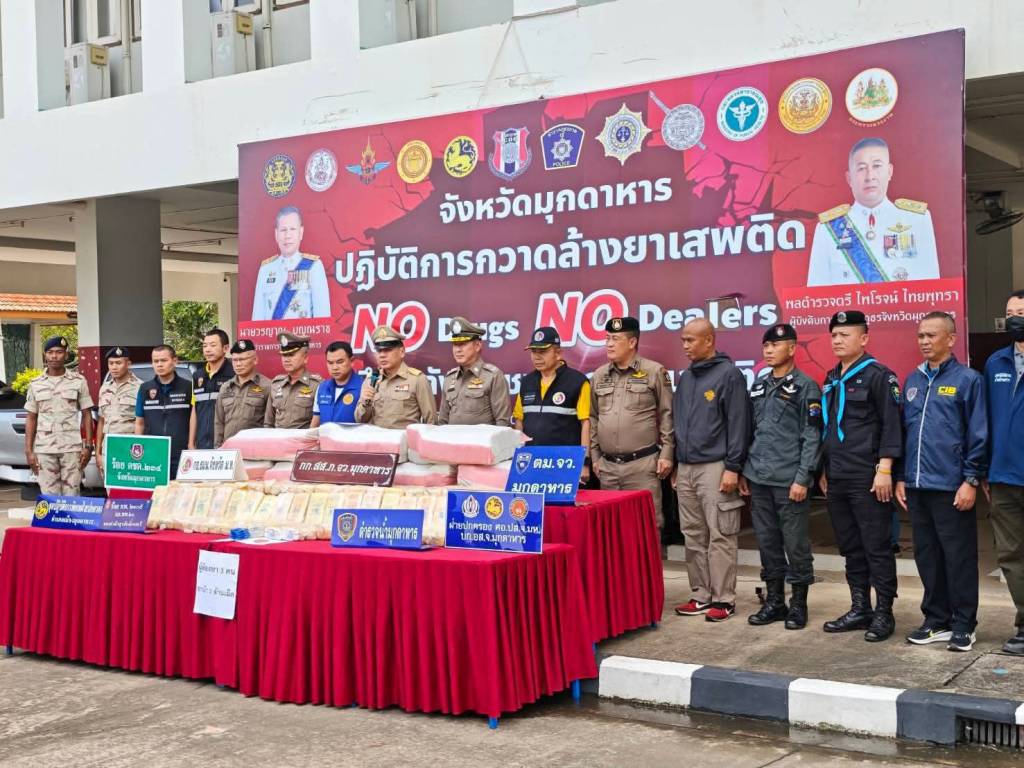 วันที่ 25 กันยายน ที่กองบังคับการตำรวจภูธรจังหวัดมุกดาหาร นายวรญาณ บุญณราช ผู้ว่าราชการจังหวัดมุกดาหาร และพล.ต.ต.ไพโรจน์ ไทยพุทรา ผบก.ภ.จว.มุกดาหาร รวมแถลงข่าว ชุดสืบ ภ.จว.มุกดาหาร ตรวจยึดยาบ้า 2 ล้านเม็ด พร้อมจับผมผู้ต้องหาได้ 3 ราย
