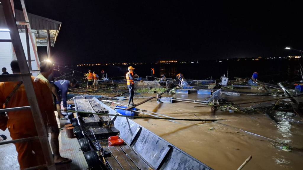 พายุซัดกระชังปลาน้ำโขงขาด! ลอยชนแพเรือตำรวจน้ำมุกดาหาร เจ้าหน้าที่เร่งรื้อถอนฝ่ากระแสน้ำเชี่ยว