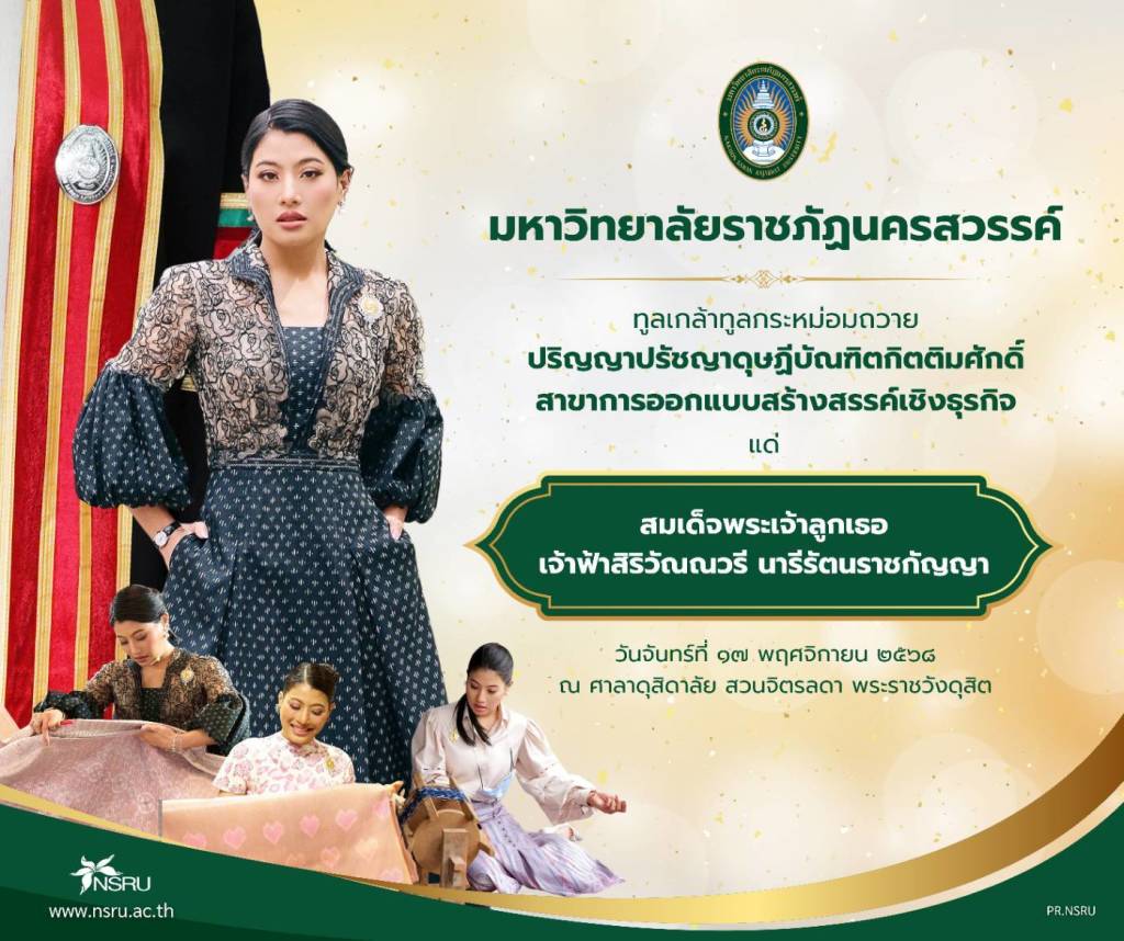 วันที่ 17 พฤศจิกายน พ.ศ. 2568 ณ ศาลาดุสิดาลัย สวนจิตรลดา พระราชวังดุสิต ดร.สว่าง ภู่พัฒน์วิบูลย์ นายกสภามหาวิทยาลัยราชภัฏนครสวรรค์ ผู้ช่วยศาสตราจารย์ ดร.ไชยรัตน์ ปราณี อธิการบดีมหาวิทยาลัยราชภัฏนครสวรรค์ พร้อมคณะกรรมการสภามหาวิทยาลัย และคณะผู้บริหารมหาวิทยาลัยราชภัฏนครสวรรค์ ทูลเกล้าทูลกระหม่อมถวายปริญญาปรัชญาดุษฎีบัณฑิตกิตติมศักดิ์ สาขาการออกแบบสร้างสรรค์เชิงธุรกิจ แด่ สมเด็จพระเจ้าลูกเธอ เจ้าฟ้าสิริวัณณวรี นารีรัตนราชกัญญา เพื่อเฉลิมพระเกียรติในพระปรีชาสามารถด้านการออกแบบแฟชั่นและเครื่องประดับ อันทรงคุณค่าทั้งเชิงศิลปะและเศรษฐกิจ ซึ่งเป็นที่ยอมรับในระดับนานาชาติ ภายใต้แบรนด์ “SIRIVANNAVARI” และ “S’Home” ทั้งยังทรงเป็นแบบอย่างในการส่งเสริมและต่อยอดผ้าไทย ด้วยการทรงออกแบบเครื่องแต่งกายจากผ้าไหมไทยให้ร่วมสมัยและสง่างามเป็นที่ประจักษ์ในวงการแฟชั่นโลก