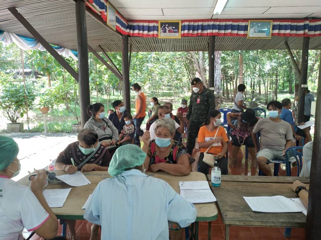 ## ร.13 พัน.1 สนับสนุนกำลังพลอำนวยความสะดวกให้ จนท.สาธารณสุขอำเภอบ้านม่วง ในการฉีดวัคซีนโควิด-19 ##