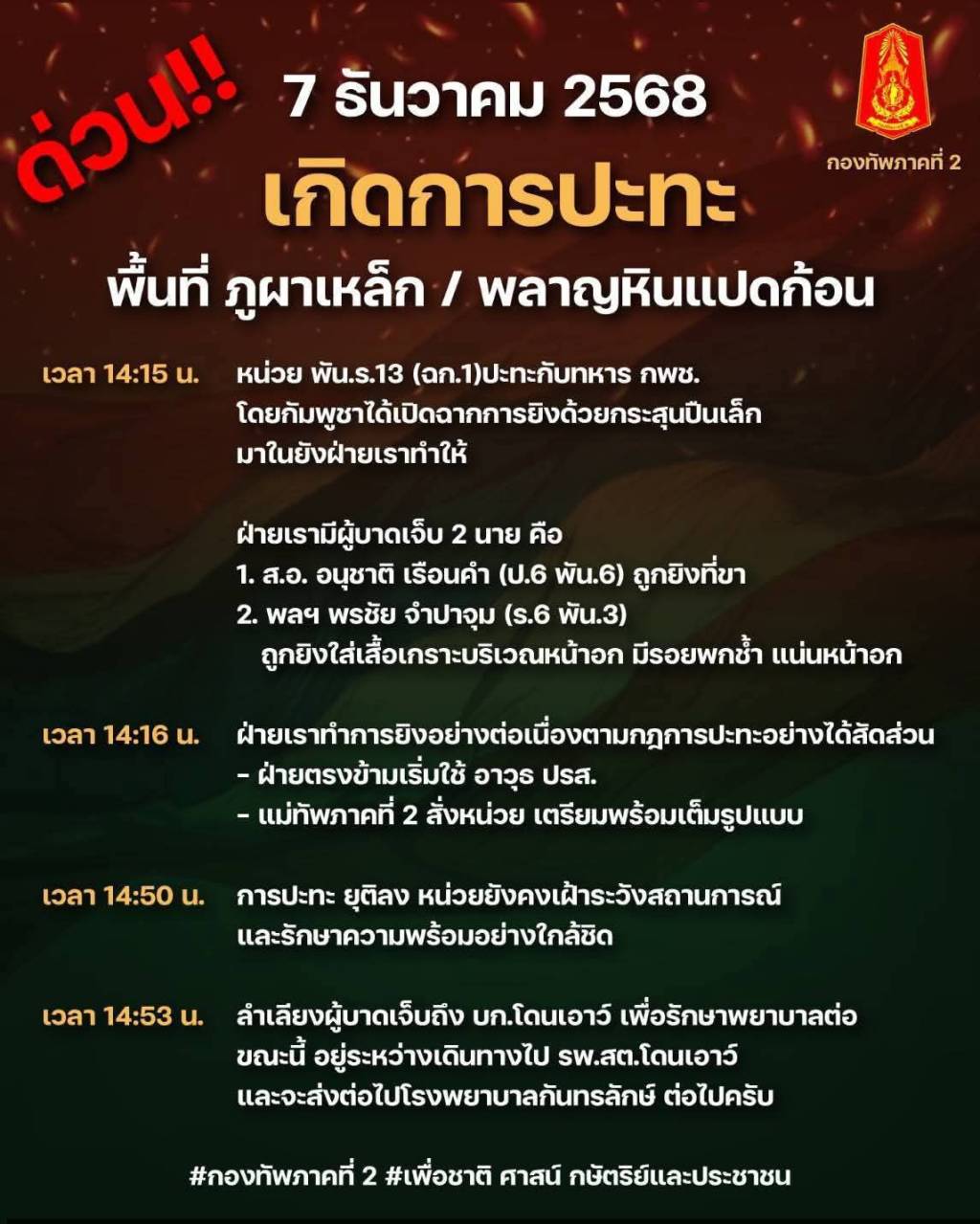 วันที่ 7 ธันวาคม 2568 เกิดเหตุปะทะรุนแรงบริเวณพื้นที่ภูผาเหล็ก – พลาญหินแปดก้อน อ.กันทรลักษ์ จ.ศรีสะเกษ กองทัพภาคที่ 2 แถลงการณ์ด่วน สั่งอพยพประชาชนในพื้นที่เสี่ยง 4 จังหวัด เพื่อความปลอดภัยสูงสุด หลังประเมินสถานการณ์ยังมีความไม่แน่นอน