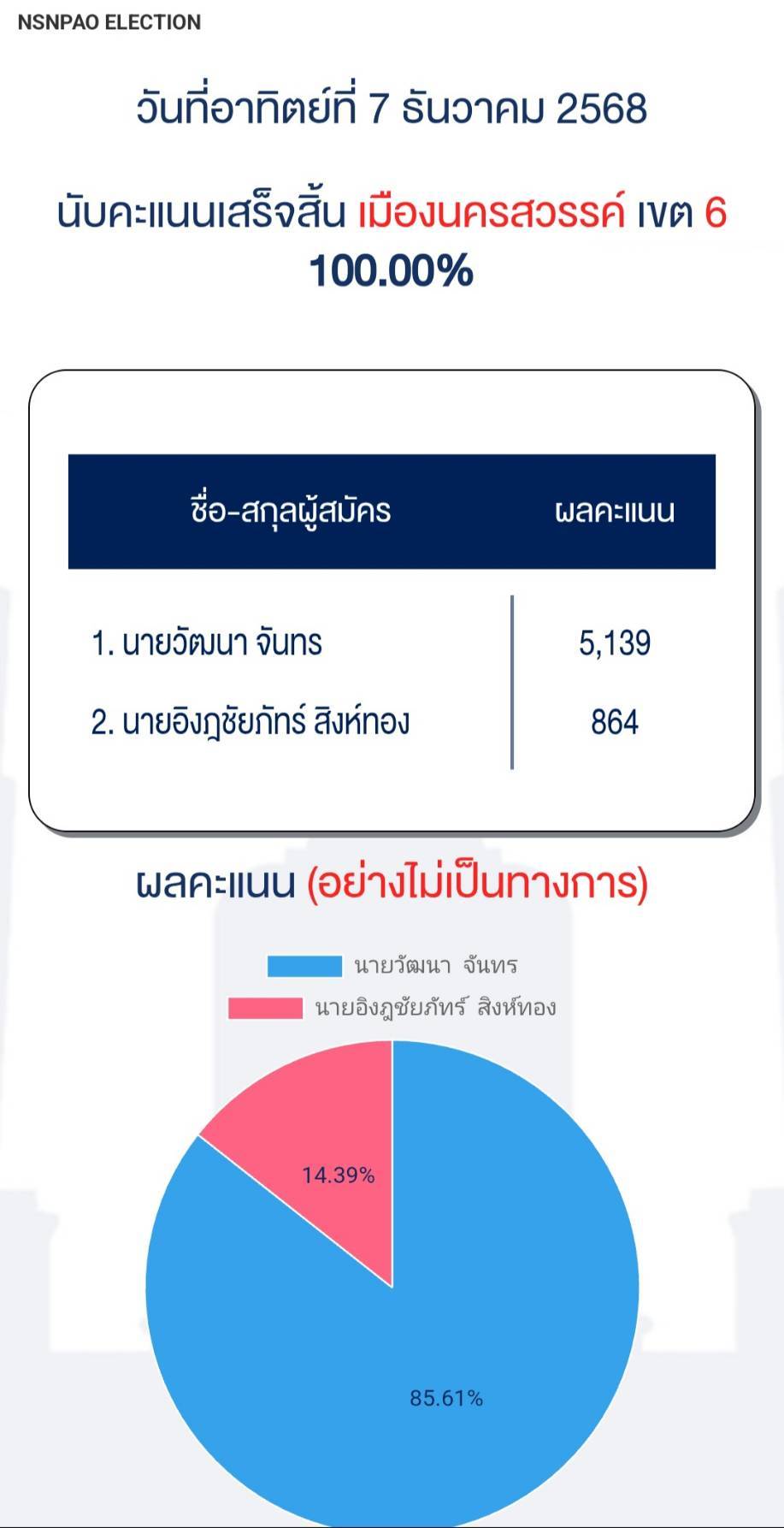 นายวัฒนา จันทร ได้คะแนน 5,139 คะแนน คิดเป็น 85.61%