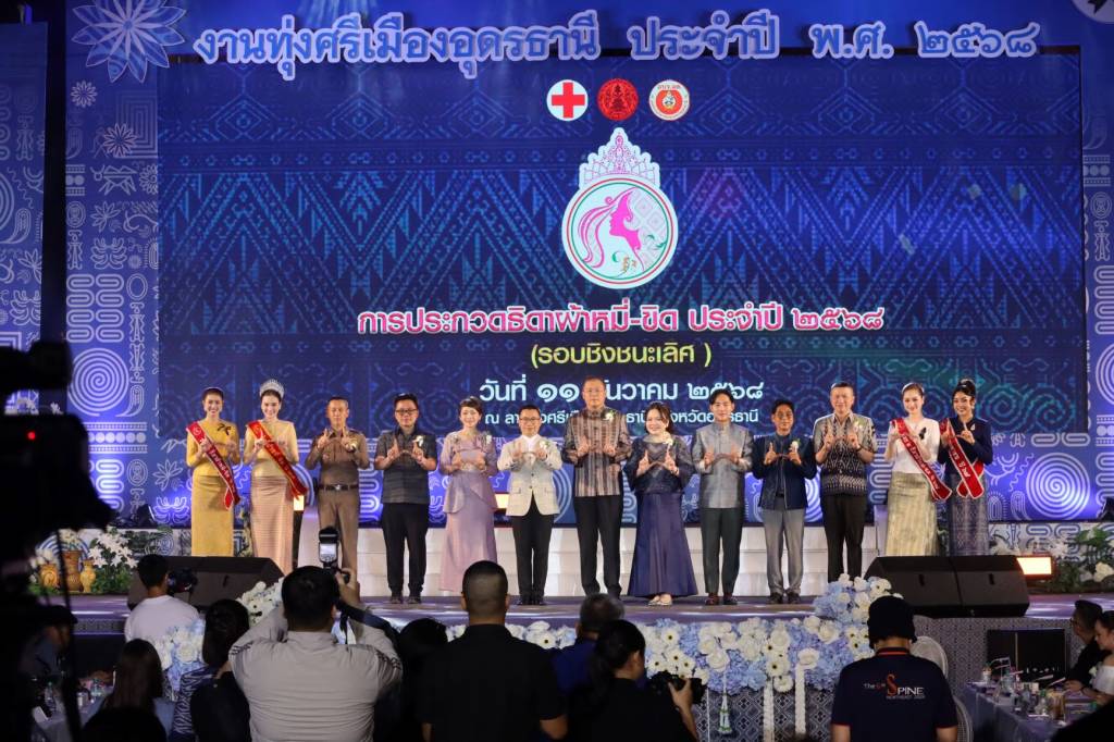 วันที่ 12 ธ.ค. 2568 เวลา 18.30 น.เป็นต้นไป นายศราวุธ เพชรพนมพร นายก อบจ.อุดรธานี พร้อม นางนุดีพร เพชรพนมพร (ภริยา) ร่วมชมการประกวดธิดาผ้าหมี่–ขิด ในงานทุ่งศรีเมือง จ.อุดรธานี ประจำปี พ.ศ. 2568 รอบชิงชนะเลิศ พร้อมมอบถ้วยรางวัล/สายสะพาย ให้กับ “น้องน้ำทิพย์-นางสาวน้ำทิพย์ พลบัวไข”รางวัลขวัญใจมหาชน คณะผู้บริหาร อบจ.อุดรธานี ส.อบจ.อุดรธานี หัวหน้าส่วน ข้าราชการ บุคลากรเจ้าหน้าที่ อบจ.อุดรธานี คณะผู้บริหารสถานศึกษา คณะครู บุคลากร เจ้าหน้าที่ โรงเรียนในสังกัด อบจ.อุดรธานี ดำเนินการจัดการประกวดธิดาผ้าหมี่–ขิด ในงานทุ่งศรีเมือง จ.อุดรธานี ประจำปี พ.ศ. 2568 ณ เวทีกลางงานทุ่งศรีเมือง จ.อุดรธานี โดยมี นายณัฐพงศ์ คำวงศ์ปิน รอง ผวจ.อุดรธานี เป็นประธานกล่าวเปิดงานฯ นางหทัยรัตน์ เพชรพนมพร ส.ส.เขต 2 จ.อุดรธานี นายสมัคร บุญปก นายชัชวาล ลือคำหาญ รองนายก อบจ.อุดรธานี นายวันไชย ศิริมา ปลัด อบจ.อุดรธานี คณะผู้บริหาร ส.อบจ.อุดรธานี คณะกรรมการตัดสินการประกวดธิดาผ้าหมี่-ขิด ประจำปี พ.ศ. 2568 หัวหน้าส่วนราชการ ภาคเอกชน ประชาชนชาว จ.อุดรธานี และ นักท่องเที่ยวให้ความสนใจเข้าร่วมชมและเชียร์ เป็นกำลังใจให้ผู้เข้าประกวดทั้ง 15 สาวงาม นอกจากนี้ยังได้รับเกียรติจาก นายราชันย์ ซุ้นหั้ว ผวจ.อุดรธานี นายณฐพล วิถี รอง ผวจ.อุดรธานี ประธานคณะกรรมการจัดการประกวดธิดาผ้าหมี่ – ขิด ประจำปี พ.ศ. 2568 นายจักรพันธ์ จันทรภูมิ รอง ผวจ.อุดรธานี ให้เกียรติมาชม มาให้กำลังใจ พร้อมทั้งมอบรางวัลให้กับสาวงาม