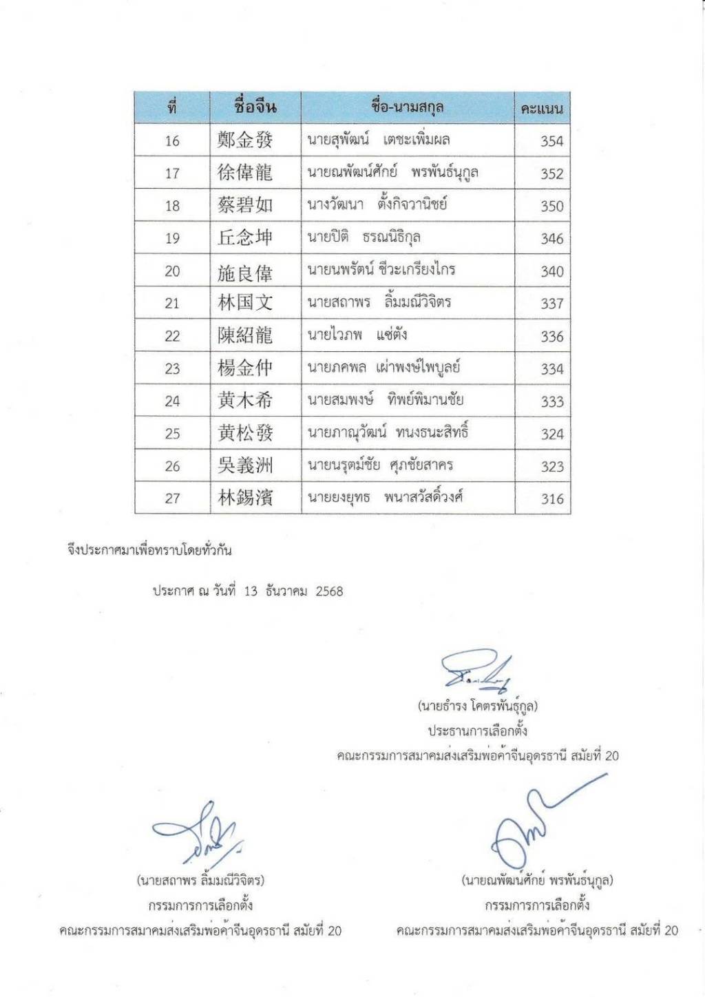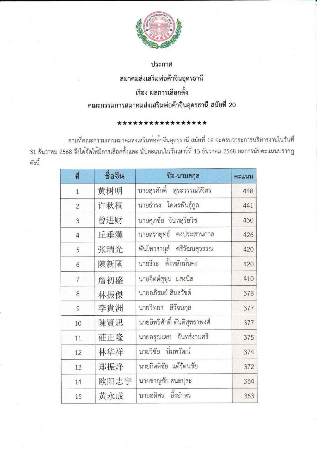 สมาคมส่งเสริมพ่อค้าจีนอุดรธานี ประกาศผลการเลือกตั้งคณะกรรมการสมาคมส่งเสริมพ่อค้าจีนอุดรธานี สมัยที่ 20 ขอแสดงความยินดีกับผู้ได้รับเลือกทั้ง 27 ท่าน ประกาศ ณ วันที่ 13 ธันวาคม 2568