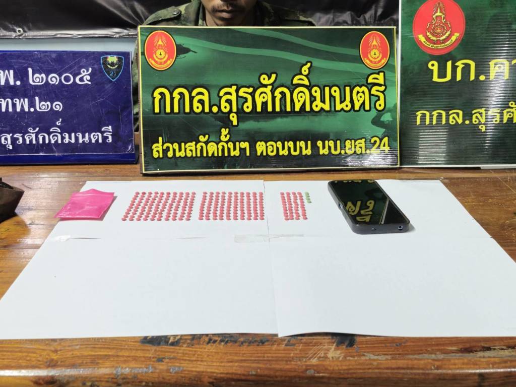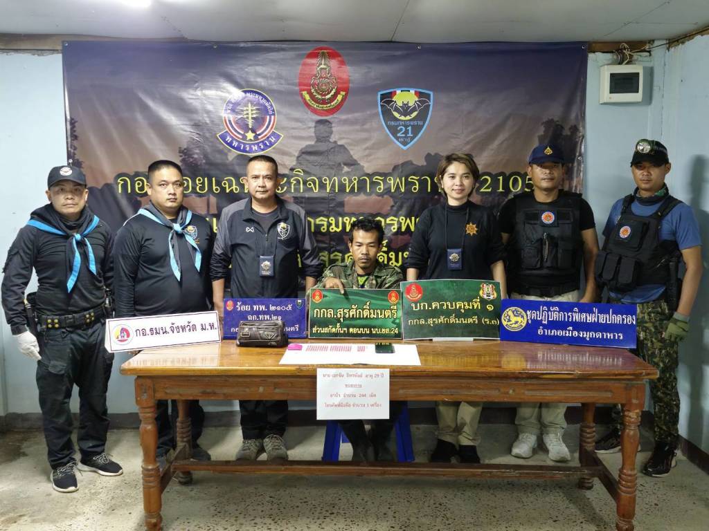 วันที่ 22 ธ.ค.68 เวลา 16.30 น. ที่บริเวณคลองห้วยแข้ ถ.มุกดาหาร-ดอนตาล ต.ศรีบุญเรือง อ.เมืองมุกดาหาร จ.มุกดาหาร หลังจากสืบทราบว่าแก๊งค้ายาในพื้นที่ ลักลอบขายาบ้าให้กับกลุ่มวัยรุ่นและผู้ใช้แรงงาน ซึ่งเป็นราคาเข้าถึงได้ง่าย  จึงเข้าแจ้งเบาะแสให้กับ ร้อยโท วันชาติ  เหมือนปืน ผู้บังคับกองร้อยเฉพาะกิจทหารพรานที่  2105 หน่วยเฉพาะกิจกรมทหารพรานที่ 21 จึงบูรณาการร่วมกับฝ่ายปกครอง และหน่วยงานความมั่นคงในพื้นที่ อำเภอเมืองมุกดาหาร  ดำเนินการปฏิบัติการตามนโยบาย การป้องกัน สกัดกั้นและปราบปรามยาเสพติดของรัฐบาล Quick Big Win "รวมพลัง รักศรัทธาแก้ปัญหายาเสพติดแบบบูรณาการ บังคับใช้กฎหมายเข้าปิดล้อมตรวจค้นต่อผู้กระทำผิดกฎหมาย ตาม พรบ.ยาเสพติด ตัดตอนเส้นทางลำเลียงยานรก ก่อนกระจายเข้าหมู่บ้าน ปฏิบัติการบุกทลายแก๊งค้ายาบ้า โดยเข้าทำการปิดล้อมตรวจค้นบริเวณคลองห้วยแข้ ถ.มุกดาหาร-ดอนตาล ต.ศรีบุญเรือง อ.เมืองมุกดาหาร จ.มุกดาหาร โดยใช้บัตรเจ้าพนักงาน ป.ป.ส.หมายเลขบัตร 6702245 ตามที่ได้รับแจ้งจากแหล่งข่าว จึงได้บูรณาการวางแผนเข้าตรวจสอบบริเวณตามที่ได้รับแจ้ง ครั้นเมื่อเวลา 16.25 น.  ชุดปฏิบัติการร่วม ฯ ได้ตรวจชาย จำนวน 1 คน กำลังเดินลงมาตามคลองห้วยแข้ ฯ ลักษณะท่าทางมีพิรุธ จนกระทั่งเวลา 16.30 น.ชุดปฏิบัติการร่วม ฯ ที่เฝ้าตรวจและสังเกตการณ์อยู่ใกล้ๆ จึงได้แสดงตัวให้สัญญาณหยุดเพื่อขอตรวจค้น เมื่อชายดังกล่าวเห็นว่าเป็น จนท.จึงได้พยายามที่จะวิ่งหลบหนี แต่เจ้าหน้าที่ควบคุมตัวไว้ได้ ทราบชื่อ นายเอกชัย ธิพรพันธ์ อายุ 29 ปี จากนั้น ชุดปฏิบัติร่วม ฯ จึงได้แสดงความบริสุทธิ์ใจก่อนทำการตรวจค้นภายในร่างกาย ผลการตรวจค้น พบถุงพลาสติกสีชมพูลักษณะกดปิดดึงเปิดประทับตราอักษร A จำนวน 1 ถุง ภายในบรรจุยาเสพติดให้โทษประเภท 1 (ยาบ้าหรือเมทแอมเฟตามีน) เม็ดสีแดง จำนวน 240 เม็ด และเม็ดสีเขียว จำนวน 4 เม็ด รวมยาบ้าทั้งสิ้น จำนวน 244 เม็ด ซุกซ่อนอยู่ภายในกระเป๋าสะพายสีน้ำตาลของนายเอกชัย   ธิพรพันธ์ ฯ ที่สะพายอยู่ จนท.จึงทำการควบคุมตัวผู้ต้องหาพร้อมของกลางมายัง จึงทำการควบคุมตัวผู้ต้องหาพร้อมของกลางมายัง บก.ร้อย.ฉก.ทพ.2105 ฉก.ทพ.21  เพื่อดำเนินการสอบสวนขยายผลเครือข่ายแก๊งค้ายาบ้าเพิ่มเติม และทำการบันทึกภาพและเสียงอย่างต่อเนื่องในขณะที่จับกุม จนกระทั่งส่งตัวให้พนักงานสอบสวน  ตาม มาตรา 22 วรรคหนึ่ง แห่ง พ.ร.บ.ป้องกันและปราบปรามการทรมานและการทำให้สูญหาย พ.ศ.2565    นำตัวผู้ต้องหาพร้อมของกลางส่ง พงส.สภ.เมืองมุกดาหาร เพื่อดำเนินคดีตามกฎหมายต่อไป