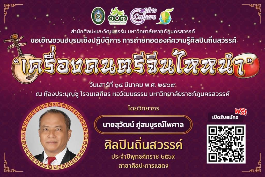 สำนักศิลปะและวัฒนธรรม มหาวิทยาลัยราชภัฏนครสวรรค์ เปิดพื้นที่แห่งการเรียนรู้ ขอเชิญชวนผู้ที่สนใจเข้าร่วมอบรมเชิงปฏิบัติการ เพื่อศึกษาและสัมผัสเสน่ห์ของดนตรีจีนไหหลำ วิทยากรโดย นายสุวัฒน์ ภู่สมบูรณ์ไพศาล ศิลปินถิ่นสวรรค์ ประจำปีพุทธศักราช 2569 สาขาศิลปะการแสดง พบกัน วันเสาร์ที่ 14 มีนาคม 256 ณ ห้องประชุมบุญชู โรจนเสถียร หอวัฒนธรรม  มหาวิทยาลัยราชภัฏนครสวรรค์