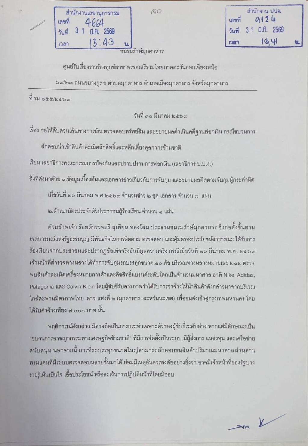 วันที่ 30 มีนาคม 2569 ร้อยตำรวจตรี สุเทียน ทองโสม ประธานชมรมรักษ์มุกดาหาร เปิดเผยว่า ชมรมได้ทำหนังสือถึงเลขาธิการคณะกรรมการป้องกันและปราบปรามการฟอกเงิน (เลขาธิการ ป.ป.ง.) เพื่อขอให้สืบสวนเส้นทางการเงิน ตรวจสอบทรัพย์สิน และขยายผลดำเนินคดีฐานฟอกเงินกับขบวนการลักลอบนำเข้าสินค้าละเมิดลิขสิทธิ์และหลีกเลี่ยงศุลกากรข้ามชาติ ซึ่งส่งผลกระทบต่อความมั่นคงทางเศรษฐกิจของประเทศอย่างรุนแรง