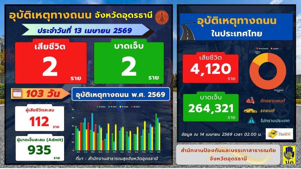 ศูนย์อำนวยการความปลอดภัยทางถนนจังหวัดอุดรธานี ขอรายงานข้อมูลอุบัติเหตุทางถนนช่วงเทศกาลสงกรานต์ พ.ศ. 2569
