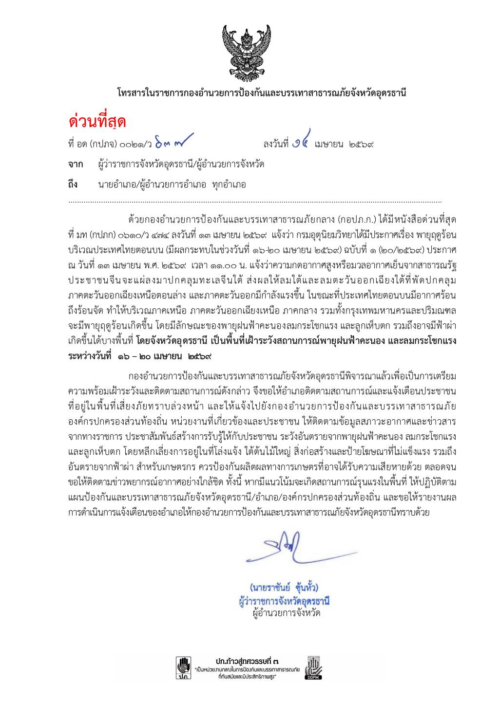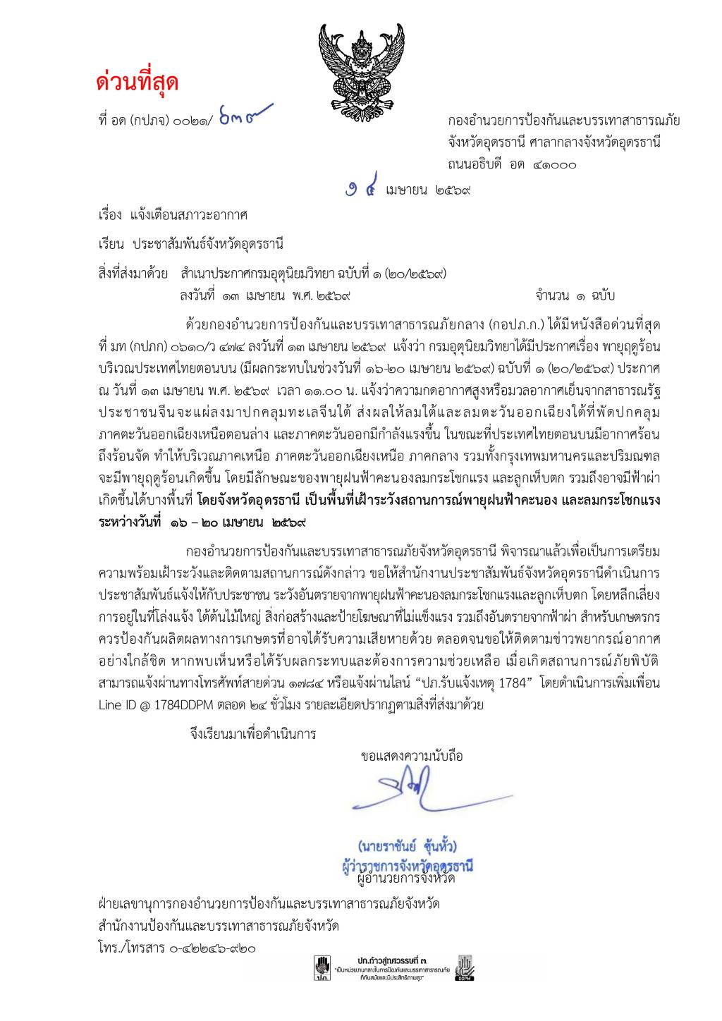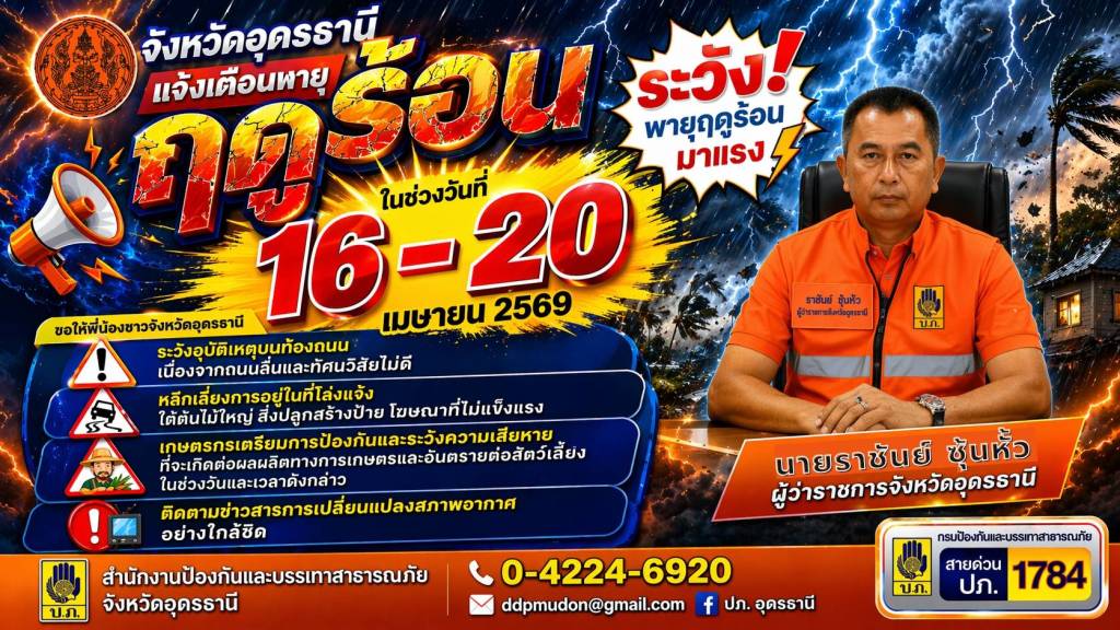จังหวัดอุดรธานี แจ้งเตือน “พายุฤดูร้อนบริเวณประเทศไทยตอนบน” มีผลกระทบระหว่างวันที่ 16 - 20 เมษายน 2569
