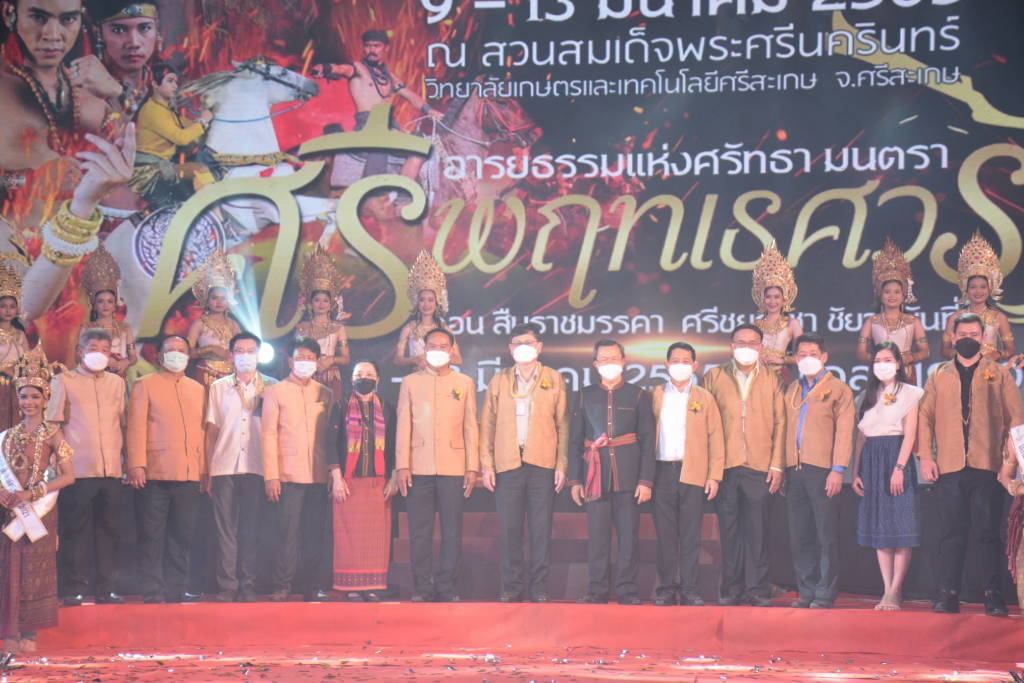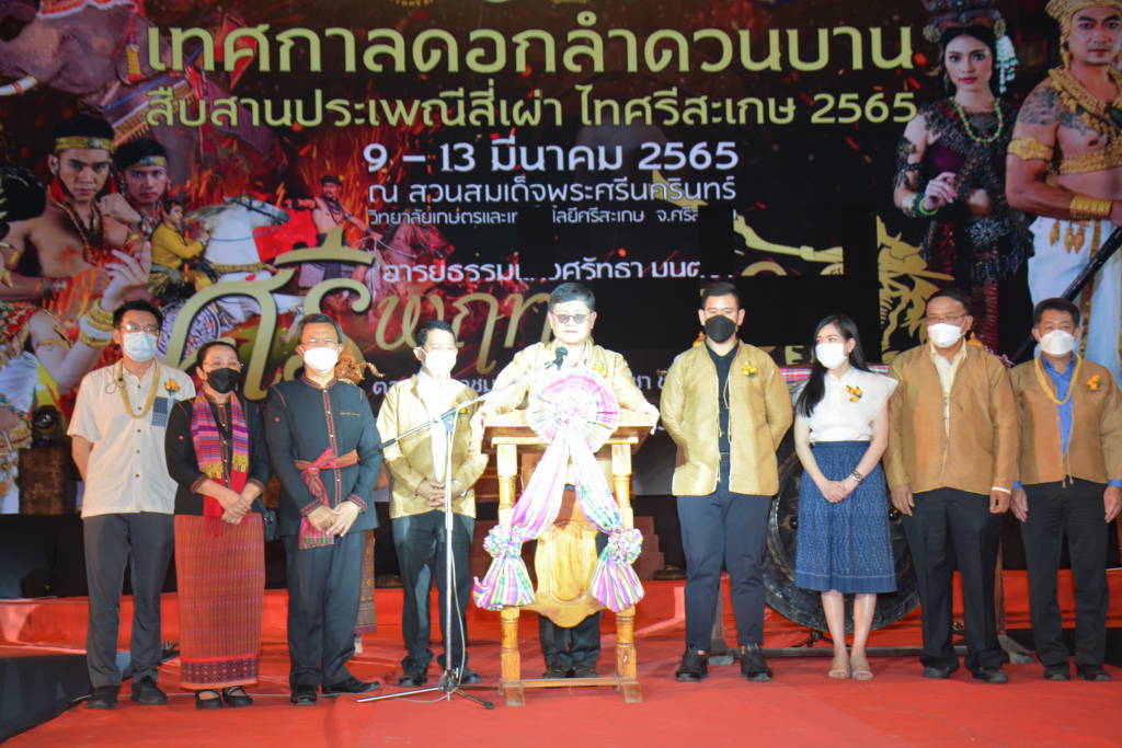 เมื่อเวลา 18.30 น.วันที่ 11 มี.ค.65 ผู้สื่อข่าวรายงานว่า ที่บริเวณสวนสมเด็จพระศรีนครินทร์ศรีสะเกษ อ.เมือง จ.ศรีสะเกษ ศาสตราจารย์พิเศษ ดร.เอนก เหล่าธรรมทัศน์ รมว.การอุดมศึกษา วิทยาศาสตร์ วิจัยและนวัตกรรม ได้เดินทางไปเป็นประธานในพิธีเปิดงานเทศกาลดอกลำดวนบาน สืบสานประเพณีสีเผ่าไท ศรีสะเกษ ประจำปี 2565 ซึ่ง อบจ.ศรีสะเกษ ร่วมกับ จ.ศรีสะเกษ มหาวิทยาลัยราชภัฏศรีสะเกษ วิทยาลัยเกษตรและเทคโนโลยีศรีสะเกษ ส่วนราชการ พ่อค้า และประชาชน ได้ร่วมจัดงานนี้ขึ้น ระหว่างวันที่ 9 – 13 มี.ค. 65 ณ สวนสมเด็จพระศรีนครินทร์ศรีสะเกษ ซึ่งปีนี้จัดการแสดงแสงสีเสียง "อารยธรรม แห่งศรัทธา มนตรา ศรีพฤทเธศวร" เพื่อสืบสานตำนานการสร้างเมืองศรีสะเกษได้อย่างสวยงามยิ่งใหญ่ตระการตามากยิ่งกว่าทุกปีที่ผ่านมา โดยมี นายวิชิต ไตรสรณกุล นายก อบจ.ศรีสะเกษ ประธานกรรมการจัดงาน เป็นผู้กล่าวรายงาน และมี นายวัฒนา พุฒิชาติ ผวจ.ศรีสะเกษ นายสำรวย เกษกุล นายอนุรัตน์ ธรรมประจำจิต นายนพ พงศ์ผลาดิสัย รอง ผวจ.ศรีสะเกษ นพ.จาตุรงค์ เพ็งนรพัฒน์ ส.ส.ศรีสะเกษ เขต 4 พรรคเพื่อไทย รศ.ดร.ประกาศิต อานุภาพแสนยากร อธิการบดี มรภ.ศรีสะเกษ นายวิทยา วิรารัตน์ ประธานสภาวัฒนธรรม จ.ศรีสะเกษ ดร.กัลยาณี ธรรมจารีย์ นายกสมาคมส่งเสริมเครือข่ายการท่องเที่ยวศรีสะเกษและกรรมการสภาอุตสาหกรรมท่องเที่ยวแห่งประเทศไทย หัวหน้าส่วนราชการ พ่อค้า ประชาชน นักท่องเที่ยว มาให้การต้อนรับและร่วมชมการแสดงในครั้งนี้