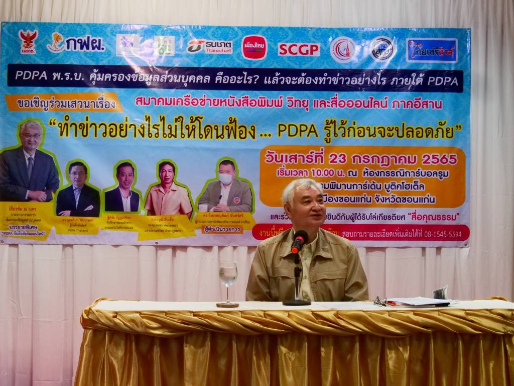 เมื่อวันที่ 23 กรกฎาคม 2565 ณ ห้องกรรณิการ์บอลรูม โรงแรมพิมานการ์เด้น บูติคโฮเต็ล อำเภอเมืองขอนแก่น จังหวัดขอนแก่น นายเธียรชัย ณ นคร ประธานกรรมการคุ้มครองข้อมูลส่วนบุคคล เป็นประธานกล่าวเปิดงานเสวนาเรื่อง “ทำข่าวอย่างไรไม่ให้โดนฟ้อง … PDPA รู้ไว้ก่อนจะปลอดภัย” มอบโล่ประกาศเกียรติคุณ สื่อคุณธรรม และมอบเงินสงเคราะห์ช่วยเหลือสื่อมวลชนที่พิการทางสายตา โดยมี พันโท พิสิษฐ์ ชาญเจริญ นายกสมาคมเครือข่ายหนังสือพิมพ์ วิทยุ และสื่อออนไลน์ ภาคอีสาน ,คณะกรรมการบริหารสมาคม, สื่อมวลชนภาคอีสาน และแขกผู้มีเกียรติ ร่วมงาน