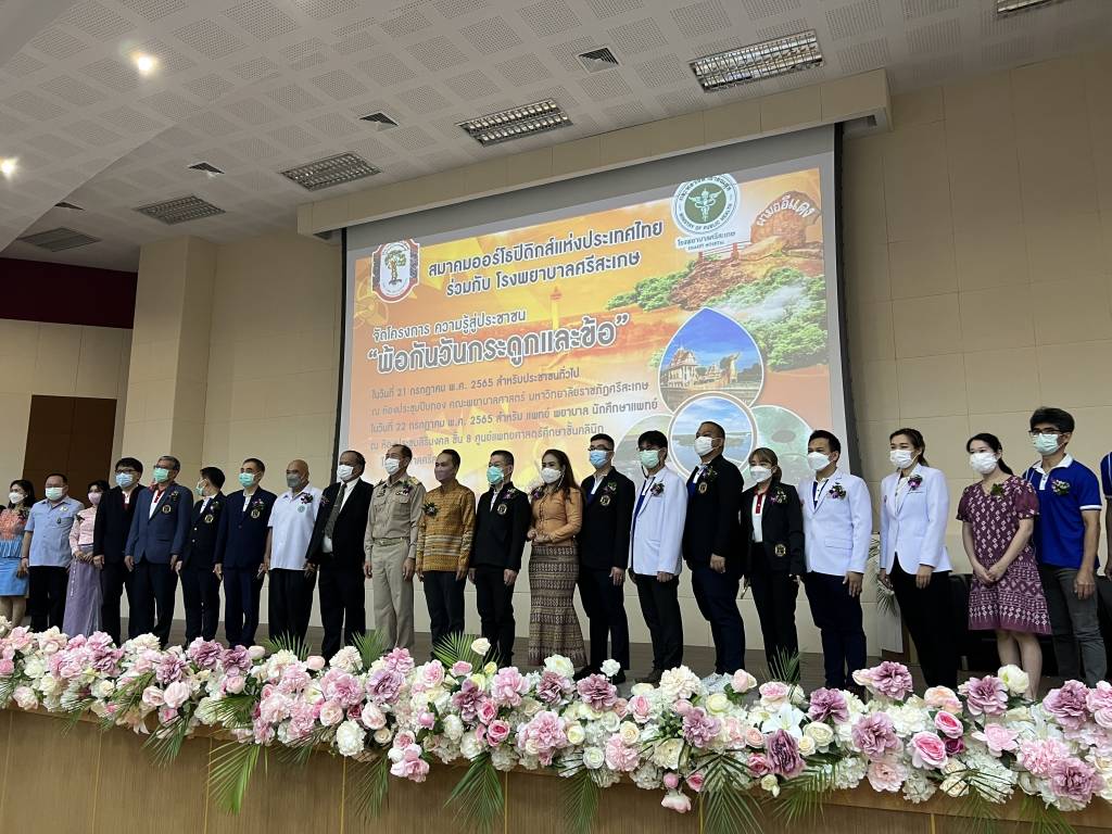 นพ.ชลวิทย์ หลาวทอง ผอ.รพ.ศรีสะเกษ เปิดเผยต่อไปว่า ตนมีความห่วงใยประชาชนที่ป่วยเป็นโรคกระดูกพรุนและโรคข้อเสื่อมหรือผู้ที่อยู่ในกลุ่มเสี่ยงที่จะเกิดโรคเป็นอย่างมาก ดังนั้น เมื่อเร็ว ๆ นี้ รพ.ศรีสะเกษจึงได้ร่วมกับสมาคมออร์โธปิดิกส์แห่งประเทศไทย ได้จัดการอบรมวิชาการ“โครงการพ้อกันวันกระดูกและข้อโรงพยาบาลศรีสะเกษ ปี 2565” ขึ้นที่ห้องประชุมปีบทอง คณะพยาบาลศาสตร์ มหาวิทยาลัยราชภัฎ ศรีสะเกษ จ.ศรีสะเกษ โดยได้รับเกียรติจาก นายนพ พงศ์ผลาดิสัย รอง ผวจ.ศรีสะเกษ เป็นประธานในพิธีเปิดการอบรม โดยคณะวิทยากรนำโดย พล.ต.ศ.นพ.ทิพชาติ บุณยรัตพันธุ์ ซึ่งผู้เข้าร่วมประชุมในครั้งนี้ ประกอบด้วยแพทย์ พยาบาล นักกายภาพบำบัด เจ้าหน้าที่สาธารณสุขจากโรงพยาบาล ศรีสะเกษ โรงพยาบาลชุมชน โรงพยาบาลส่งเสริมสุขภาพประจำตำบล รวมทั้งภาคประชาชน รวมทั้งสิ้น 200 คน ทั้งนี้ เพื่อให้กลุ่มประชาชนมีความรู้เพื่อป้องกันดูแลตนเองได้ถูกต้อง และบุคลากรด้านสาธารณสุข ได้รับการพัฒนาด้านความรู้อย่างต่อเนื่องเพื่อจะสามารถดูแลผู้ป่วยได้ถูกต้องและก่อให้เกิดประโยชน์กับผู้ป่วยให้มากที่สุด ส่งเสริมให้เกิดมาตรฐานทางด้านการรักษาพยาบาล และเสริมสร้างความรู้ความเข้าใจในเรื่องการเกิดโรคตลอดจนวิธีป้องกันไม่ให้เกิดโรคแก่ประชาชนทั่วไป อันจะทำให้บรรลุวัตถุประสงค์ของภารกิจหลักที่จะสร้างองค์กรเป็นโรงพยาบาลตติยภูมิขั้นสูงที่ได้มาตรฐาน เพื่อสุขภาพที่ดีของประชาชน สมดังวิสัยทัศน์ของโรงพยาบาลที่ได้ตั้งไว้