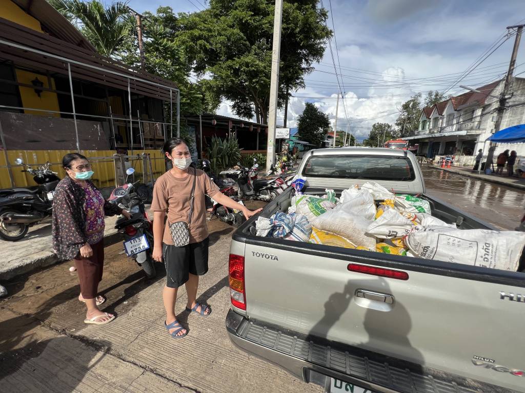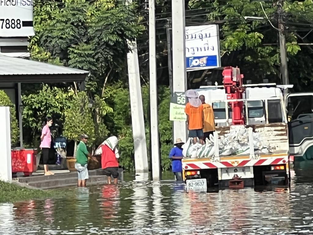 ศรีสะเกษ ชุมชนหนองหมูน้ำท่วมถึงหลังคาแล้วขณะที่ชาวบ้านหนองอุทัยเร่งขนของหนีน้ำท่วม เร่งแจกจ่ายกระสอบทรายเพื่อให้ประชาชนนำเอาไปป้องกันน้ำท่วมบ้านเรือนของตนเอง