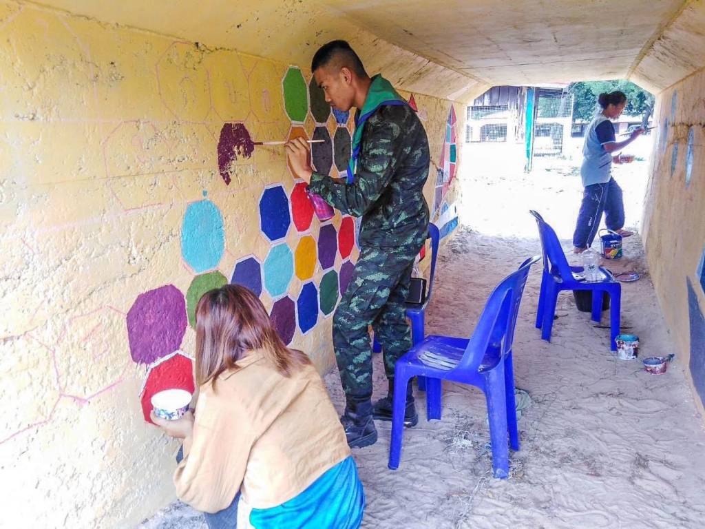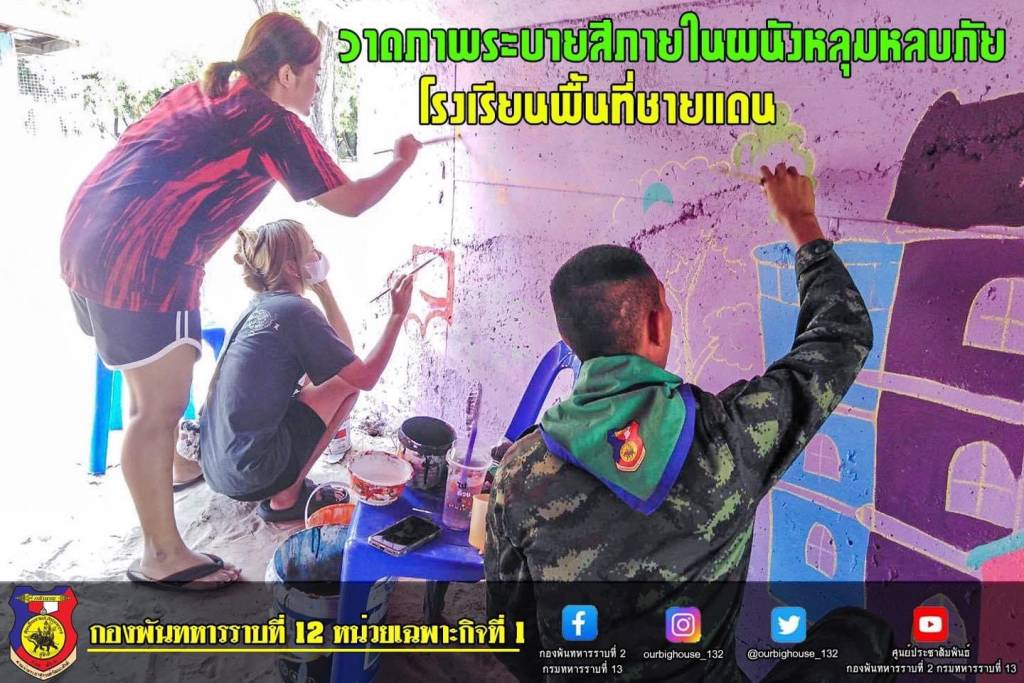 เมื่อวันที่ 7 เมษายน 2566 พันโท วิทยา สาริยา ผู้บังคับกองพันทหารราบที่ 12 หน่วยเฉพาะกิจที่ 1 (ร.13 พัน.2) จัดกำลังพลของหน่วย พร้อมด้วยผู้นำชุมชน และประชาชนในพื้นที่ ร่วมกับคณะครูและนักเรียนโรงเรียนบ้านเสาธงชัย ตำบลเสาธงชัย อำเภอกันทรลักษ์ จังหวัดศรีสะเกษ ช่วยกันวาดภาพระบายสี จัดทำสื่อการเรียนการสอนด้านภาษา วัฒนธรรมและด้านวิทยาศาสตร์ ภายในหลุมหลบภัยในพื้นที่ของโรงเรียน ทั้งนี้เพื่อเป็นแหล่งศึกษาเรียนรู้ให้กับน้องๆ เด็กนักเรียนในห้วงเปิดเทอม อีกทั้งทำให้หลุมหลบภัยเกิดความสวยงามตลอดจน เป็นการใช้เวลาว่างและใช้พื้นที่ภายในโรงเรียนให้เกิดประโยชน์สูงสุด จากการร่วมกันจัดกิจกรรมในครั้งนี้ ทำให้คณะครูและเด็กนักเรียน รวมถึงผู้นำชุมชนและประชาชนในพื้นที่ มีความรู้สึกปลาบปลื้มใจ และรู้สึกยินดีเป็นอย่างมากที่กองพันทหารราบที่ 12 หน่วยเฉพาะกิจที่ 1 ได้จัดกำลังพลของหน่วย เข้ามาสนับสนุนในการจัดกิจกรรมให้กับโรงเรียนในครั้งนี้
