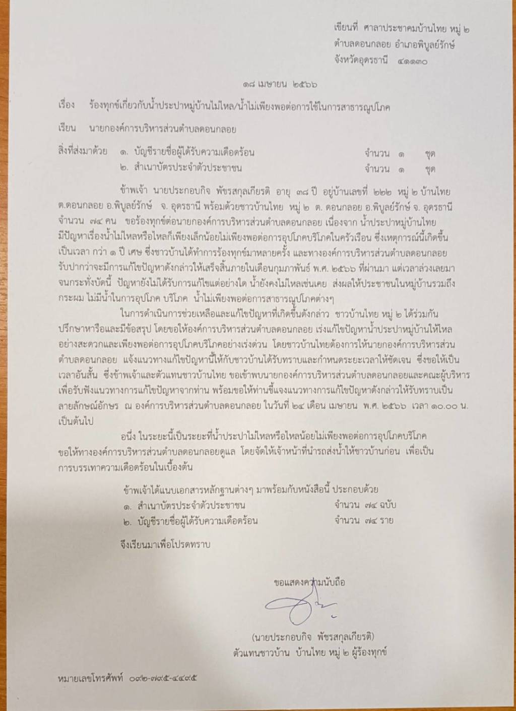 วันนี้ 18 เมษายน 66 ชาวบ้านไทย หมู่ที่ 2 ต.ดอนกลอย อ.พิบูลย์รักษ์ จ.อุดรธานี กว่า74คน พร้อมใจกันลงชื่อในหนังสือร้องทุกข์ เกี่ยวกับน้ำปะปาของหมู่บ้านที่มีปัญหาไหลรวยริน ไม่มา ไม่มี ไม่ไหล ซึ่งอยู่ในการกำกับดูแลขององค์การบริหารส่วนตำบลดอนกลอย อ.พิบูลย์รักษ์ จ.อุดรธานี โดยก่อนหน้านี้ชาวบ้านไทย ได้ร้องทุกข์ถึงความเดือดร้อนไปยังองค์การบริหารส่วนตำบลดอนกลอย แล้วว่าขอร้องให้ช่วยจัดการการบริการสาธารณะด้านสาธารณูปโภค(น้ำปะปา) เพื่อให้ทราบถึงปัญหาความเดือดร้อนดังกล่าวของชาวบ้าน แต่ได้รับเพียงแต่คำตอบเป็นวาจาว่าจะดำเนินการวางท่อเมนใหม่ตั้งแต่เดือนกุมภาพันธ์ 2566 จนกระทั้งบัดนี้ก็ยังไม่ได้ดำเนินการใดๆจากปัญหาดังกล่าวที่เรื้อรังมาปีกว่า ชาวบ้านบางส่วนต้องลำบากถึงกับต้องเข็นรถไปตักน้ำจากบ่อ(น้ำส้าง)เก่าของหมู่บ้านเพื่อใช้ในการอุปโภคประทังไปวันต่อวัน วันนี้เพื่อให้เป็นไปตามระบบขั้นตอนชาวบ้านไทย จึงรวมตัวกันลงชื่อร้องทุกข์ไปยังนายกองค์การบริหารส่วนตำบลดอนกลอย เพื่อให้เร่งแก้ไขปัญหาดังกล่าวในทันที และหากคำร้องทุกข์ดังกล่าวไม่ได้คำตอบอันเป็นที่น่าพึงพอใจ หลังวันที่ 24 เมษายน นี้ จะรวมตัวเพื่อยื่นหนังสือร้องทุกข์ต่อผู้ว่าราชจังหวัดอุดรธานี ต่อไป