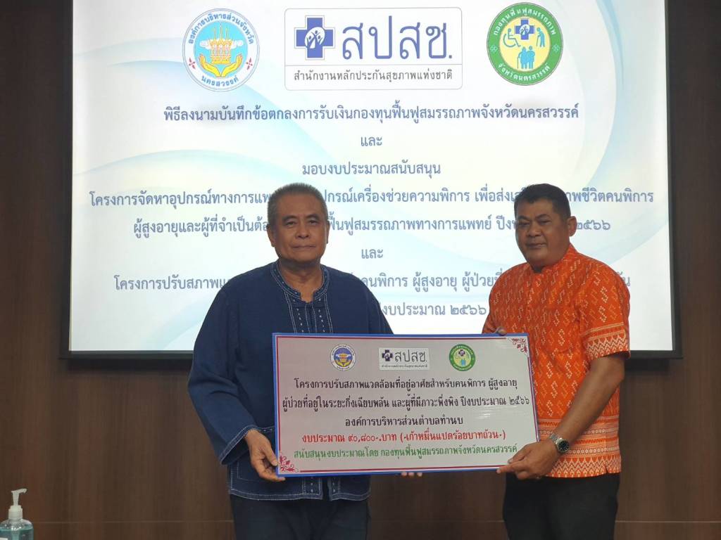 ลงนามกองทุนฟื้นฟู อบจ.นครสวรรค์ ร่วมกับ สปสช. ทำ MOU การรับเงินและมอบเชคให้ เทศบาล อบต. จัดหาอุปกรณ์การแพทย์ ปรับปรุงที่อยู่ให้คนพิการ ผู้สูงอายุ