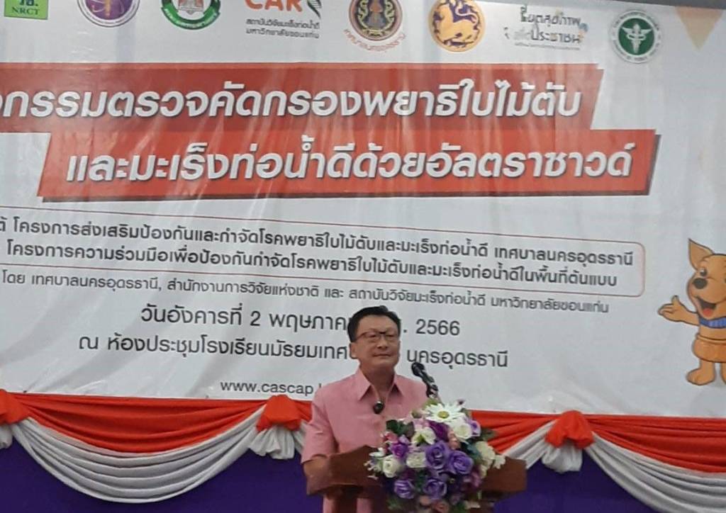 ดร.ธนดร พุทธรักษ์ นายกเทศมนตรีนครอุดรธานี กล่าวว่า “กิจกรรมตรวจคัดกรองพยาธิใบไม้ตับและมะเร็งท่อน้ำดีด้วยอัลตราซาวด์ ภายใต้ โครงการส่งเสริมป้องกันและกำจัดโรคพยาธิใบไม้ตับและมะเร็งท่อน้ำดี เทศบาลนครอุดรธานี และ โครงการความร่วมมือเพื่อป้องกันกำจัดโรคพยาธิใบไม้ตับและมะเร็งท่อน้ำดีในพื้นที่ต้นแบบ ครั้งนี้ เกิดจากความตระหนักและต้องการแก้ไขปัญหาโรคพยาธิใบไม้ตับและมะเร็งท่อน้ำดี ของหน่วยงานต่างๆ ที่มีส่วนเกี่ยวข้องในพื้นที่เทศบาลนครอุดรธานี ซึ่งถือเป็นการขับเคลื่อนการแก้ไขปัญหาของพื้นที่ โดยหวังก่อให้เกิดเครือข่ายพัฒนาความร่วมมือทั้งส่วนราชการ เอกชน และภาคประชาชน ร่วมสร้างแรงขับเคลื่อนแก้ไขปัญหาอย่างบูรณาการและสร้างความยั่งยืน ซึ่งมีวัตถุประสงค์เพื่อสนับสนุนแผนยุทธศาสตร์กำจัดพยาธิใบไม้ตับและมะเร็งท่อน้ำดีปี 2559 - 2568 ซึ่งได้ดำเนินการในระยะแรกที่จะมุ่งเน้น 1. สร้างการรับรู้และความตระหนักในโรคพยาธิไบไม้ตับและมะเร็งท่อน้ำดีในประชาชน 2. การสร้างความรอบรู้โรคพยาธิใบไม้ตับและมะเร็งท่อน้ำดี 3. การตรวจคัดกรองพยาธิใบไม้ตับในประชาชนกลุ่มเสี่ยง 4. การคัดกรองมะเร็งท่อน้ำดีในประชาชนกลุ่มเสี่ยง 5. การพัฒนาระบบการจัดการสิ่งปฏิกูลอย่างยั่งยืน 6. การพัฒนาระบบส่งต่อเพื่อการรักษาผู้ป่วยมะเร็งท่อน้ำดีอย่างรวดเร็วและมีประสิทธิภาพ เทศบาลนครอุดรธานี ได้รับเอานโยบายและร่วมกันขับเคลื่อนกิจกรรมในมิติต่างๆ สร้างรากฐาน ในการจัดการพยาธิใบไม้ตับและมะเร็งท่อน้ำดีอย่างยั่งยืน อาทิ การตรวจคัดกรองพยาธิใบไม้ตับ และ มะเร็งท่อน้ำดีในกลุ่มเสี่ยง ดังนั้นจึงเป็นที่มาของกิจกรรมในวันนี้ ที่จะบริการตรวจคัดกรองพยาธิใบไม้ตับด้วยแอนติเจนในปัสสาวะ ด้วยนวัตกรรมชุดตรวจ OV-RDT ในประชาชนกลุ่มเสี่ยง และบริการตรวจคัดกรองมะเร็งท่อ น้ำดี ด้วยอัลตราชาวด์ แก่ประชาชน จำนวน 650 คน รวมถึงการรณรงค์ให้ความรู้โรคพยาธิใปไม้ตับและมะเร็งท่อน้ำดี ผ่านนิทรรศการต่างๆ ภายในงาน#จังหวัดอุดรธานี #องค์การบริหารส่วนจังหวัดอุดรธานี #อบจอุดรธานี #กขปเขตที่8 #มหกรรมพืชสวนโลกอุดรธานี2569