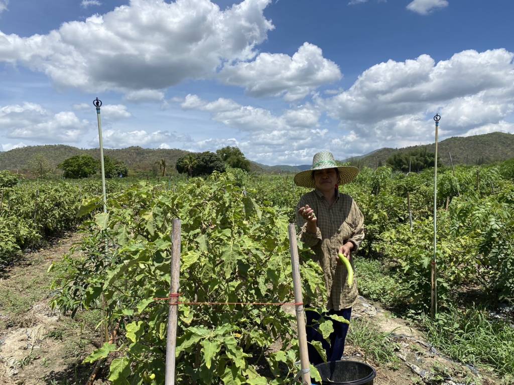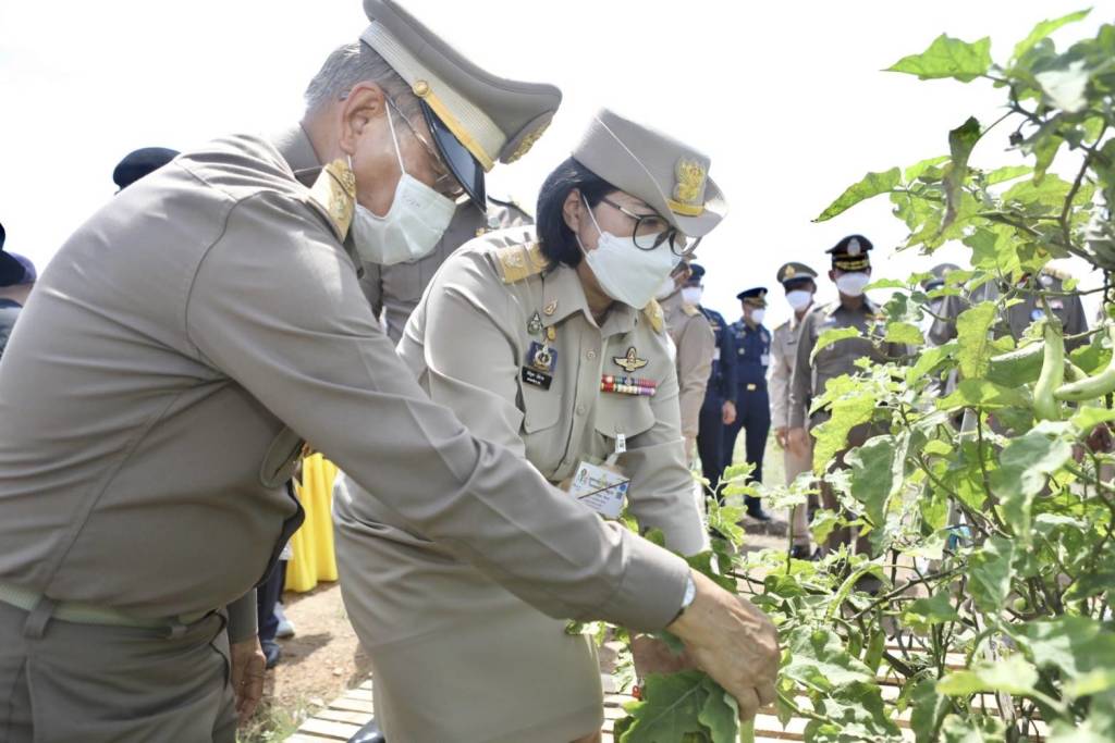 ต่อมาคณะฯ เดินทางไปเยี่ยมชมพื้นที่การเกษตรของนางนิตยา เชื้อดี เกษตรกรที่ได้รับประโยชน์จากโครงการอ่างเก็บน้ำบ้านทุ่งศาลาฯ นางนิตยา ฯ ซึ่งเดิมเคยทำงานที่โรงงานผลิตรองเท้า ในจังหวัดสมุทรปราการ แต่เมื่อมีโครงการอ่างเก็บน้ำบ้านทุ่งศาลาฯ จึงได้กลับมาทำเกษตรปลูกพืชผักแบบผสมผสานหมุนเวียนตลอดทั้งปี เช่น มะเขือ บวบ พริก ถั่วฝักยาว โดยใช้พื้นที่ทำการเกษตรจำนวน 22 ไร่ ผลผลิตมีพ่อค้าแม่ค้ารับซื้อถึงหมู่บ้าน สามารถสร้างรายได้เลี้ยงครอบครัวได้อย่างสม่ำเสมอ และเมื่อหักต้นทุนแล้วมีเงินเหลือเก็บประมาณ 100,000 บาท/ปี ปัจจุบันแบ่งพื้นที่ในการปลูกไม้ล้อมเพิ่มเติมอีกด้วยโอกาสนี้ องคมนตรีได้เยี่ยมชมแปลงและพบปะพูดคุยให้กำลังใจเกษตรกรในครั้งนี้