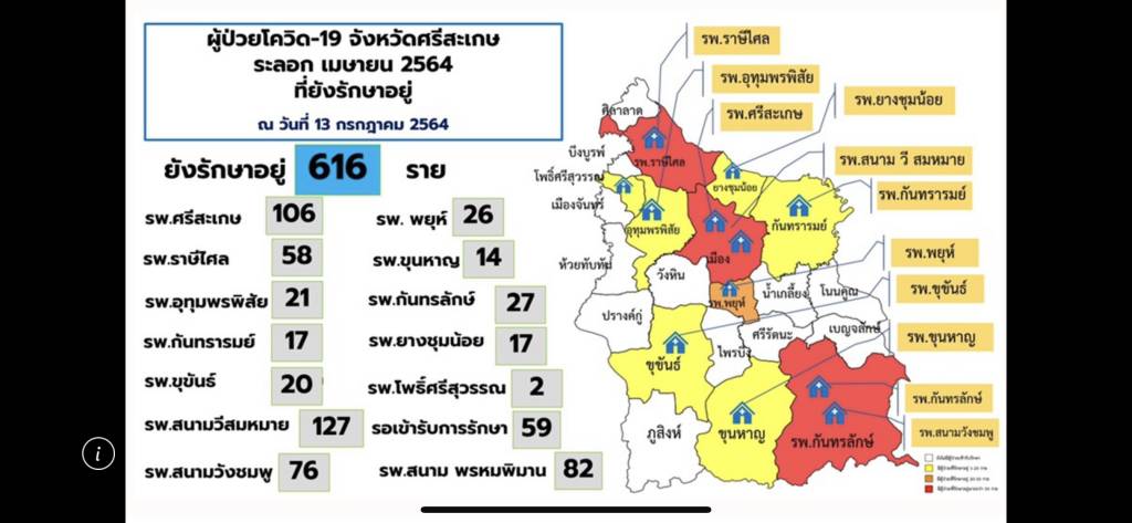 เมื่อวันที่ 13 ก.ค. 64 ผู้สื่อข่าวรายงานว่า ศูนย์ปฏิบัติการตอบโต้ภาวะฉุกเฉินกรณีโรคติดเชื้อไวรัสโควิด-19 จ.ศรีสะเกษ เปิดเผยข้อมูลผู้ติดเชื้อโควิด-19 จ.ศรีสะเกษ ประจำวันที่ 13 ก.ค. 64 ว่า มีผู้ติดเชื้อเพิ่มวันนี้ จำนวน 87 ราย มียอดสะสม 1,151 ราย มีผู้เสียชีวิตเพิ่ม 1 ราย เสียชีวิตสะสม 4 ราย ยังคงรักษาอยู่ตาม รพ.ประจำอำเภอต่าง ๆ อยู่จำนวน 616 คน โดย อ.ศรีรัตนะมีผู้ติดเชื้อเพิ่มวันนี้ จำนวน 4 ราย โดย อ.ศรีรัตนะ มีผู้ป่วยเพิ่มสูงมากที่สุดของ จ.ศรีสะเกษ รองลงมาคือ อ.กันทรลักษ์ จำนวน 131 คน และ อ.กันทรารมย์ เพิ่มวันนี้ 7 ราย มีผู้ป่วย จำนวน 94 คน ขณะที่ รพ.สนามโรงแรมพรหมพิมาน อ.เมืองศรีสะเกษ ซึ่งเป็นโรงแรมหรูกลางเมืองศรีสะเกษ ได้มีผู้ป่วยระดับสีเขียว ทยอยเข้าพักรักษาตัวอย่างต่อเนื่อง