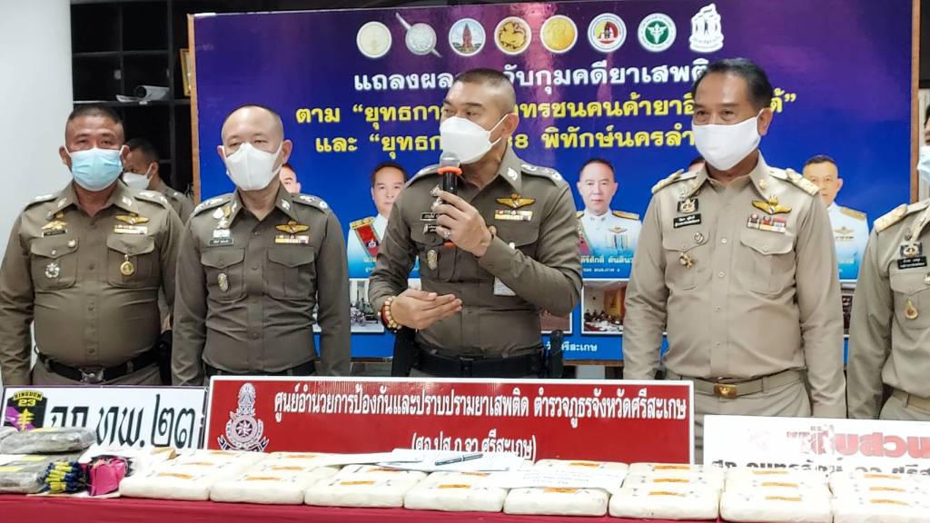เมื่อวันที่ 19 ก.ค. 64 ผู้สื่อข่าวรายงานว่า ที่ตำรวจภูธรจังหวัดศรีสะเกษ อ.เมือง จ.ศรีสะเกษ พล.ต.ท.ภาณุรัตน์ หลักบุญ ผบช.ภ.3 พร้อมด้วย พล.ต.ต.คีรีศักดิ์ ตันตินวะชัย รอง ผบช.ภ.3 (หน.ปส) นายณรงค์ วรหาญ ผู้อำนวยการสำนักงานป้องกันปราบปรามยาเสพติดภาค 3 พล.ต.ต.สันติ เหล่าประทาย ผบก.ภ.จว.ศรีสะเกษ นายสำรวย เกษกุล รอง ผวจ.ศรีสะเกษ พันเอกณัฐพงศ์ จินดาเวช รอง ผอ.กอ.รมน. ศรีสะเกษ ฝ่ายทหาร และ พ.ต.อ.ศุภชัย ศักรินพานิชกุล รอง ผบก.ภ.จว.ศรีสะเกษ/เลขานุการร่วมศูนย์อำนวยการป้องกันและปราบปรามยาเสพติดจังหวัดศรีสะเกษ ได้ร่วมกันแถลงผลการจับกุมเครือข่ายยาเสพติดรายสำคัญภายใต้ยุทธการ พิฆาตทรชน คนค้ายา อีสานใต้ และ ยุทธการ 238 พิทักษ์นครลำ ห้วงวันที่ 26มิถุนายน – 18 ก.ค.2564 ผลการจับกุมรวมทั้งสิ้น 513 คดี ผู้ต้องหา 534 คน ของกลาง ยาบ้า 408,784 เม็ด กัญชาสด 27 ต้น กัญชาแห้ง 55.97 กรัม ไอซ์ 102.45 กรัม กระท่อม 481.8 กรัม อาวุธปืน 34 กระบอก บุหรี่ยี่ห้อดังอีกจำนวนมาก โดยได้เอาของกลางทั้งหมด พร้อมด้วยทรัพย์สินที่ได้ยึดทรัพย์มา จำนวน 8 รายการ คิดเป็นมูลค่าประมาณ 1,000,000 บาท