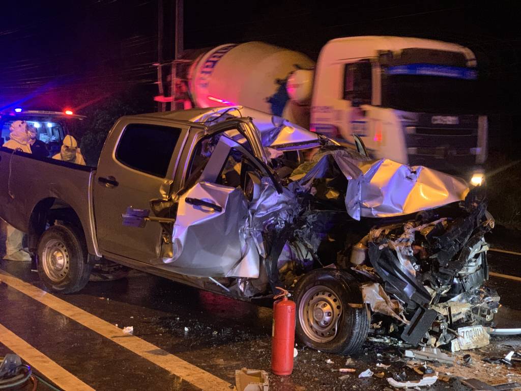 ศรีสะเกษ หนุ่มซิ่งปิคอัพฝ่าสายฝนถนนลื่นพุ่งชนท้ายรถบรรทุกโม่ปูนรอเลี้ยวดับสยองคาที่