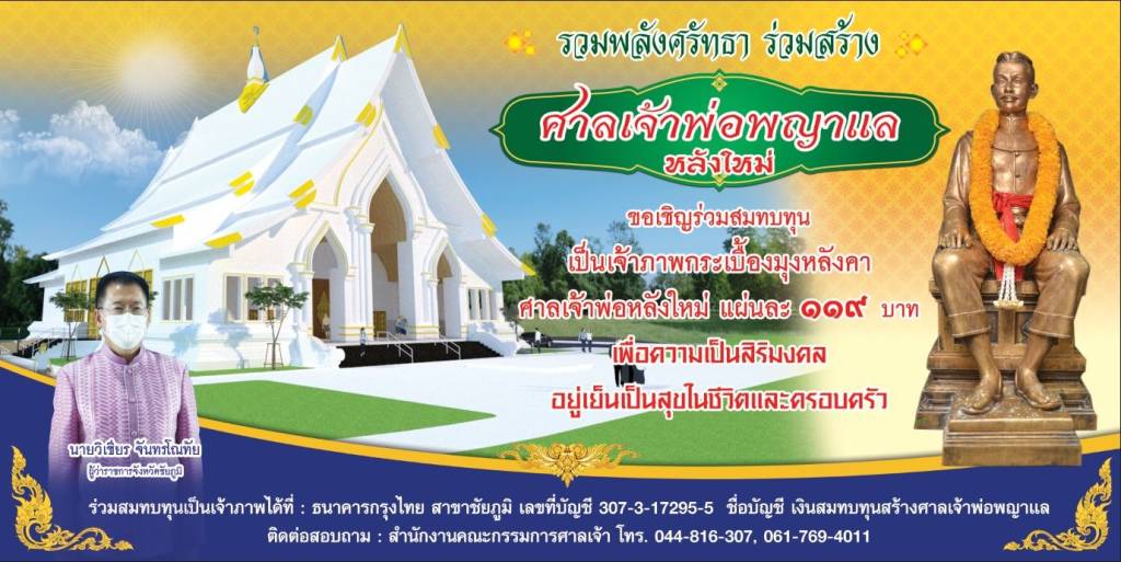 ด้านนายสิทธิพล สุทธิศักดิ์ภักดี ประธานหอการค้าจังหวัดชัยภูมิ ตัวแทน ภาคเอกชนชาวชัยภูมิ ก็ได้ร่วมเชิญชวนสร้างบุญสร้างศาลโดยการบริจาคกระเบื้องพื้น และกระเบื้องหลังคาในครั้งนี้ อีกทั้งประชาชนชาวชัยภูมิหรือท่านผู้มีจิตศรัทธาต่อองค์เจ้าพ่อพญาแลก็สามารถร่วมบุญสมทบทุนเพิ่มเติมได้ที่ สำนักงานศาลเจ้าพ่อพญาแล จ.ชัยภูมิ หรือผ่านธนาคารกรุงไทย ได้จากนี้ต่อไปได้อีกด้วย////