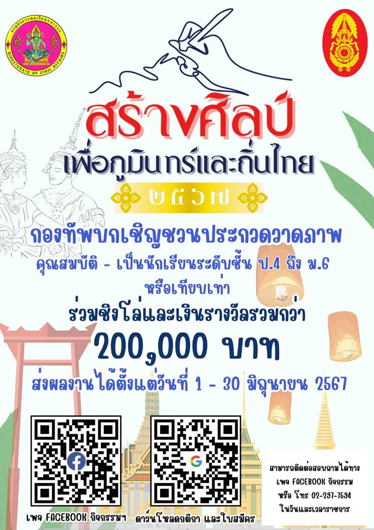 โดยสามารถส่งผลงานได้ตั้งแต่วันนี้ถึงวันที่ 30 มิถุนายน 2567 ลุ้นรับเงินรางวัลรวมกว่า 200,000 บาท สามารถติดต่อสอบถามได้ที่ เพจ Facebook ประกวดวาดภาพ “ สร้างศิลป์ เพื่อภูมินทร์และถิ่นไทย ” รายละเอียดการประกวด : https://contest-thailand.com/เพื่อภูมินทร์-ถิ่นไทย-2567/