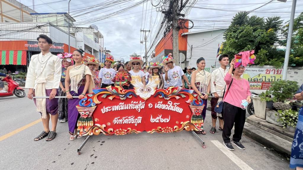 นางณัฎชุดา นันทนี ท่องเที่ยวและกีฬาจังหวัดชัยภูมิ นางเภาลีนา โล่ห์วีระ นายกองค์กรบริหารส่วนตำบลบ้านเล่า ผอ.ท่องเที่ยวและกีฬาจังหวัดชัยภูมิ คณะบริหารเทศบาลเมืองชัยภูมิ และหน่วยงานที่เกี่ยวข้อง ร่วมกันทำพิธีเปิดงานสืบสานประเพณีแห่ผีสุ่ม ที่จะมีขึ้นในระหว่าง วันที่ 14-15 ก.ย.2566 นี้ อย่างเป็นทางการ ซึ่งในวันแรกของวันที่ 14 ก.ย.66 นี้ ในการทำพิธีนำหน้ากากผีสุ่ม บายศรี เครื่องไหว้ถวายต่อหน้าอนุสาวรีย์เจ้าพ่อพญาแล หรือพระยาภักดีชุมพลเจ้าเมืองคนแรก ณ รอบวงเวียนอนุสาวรีย์เจ้าพ่อพญาแล ย่านกลางใจเมืองชัยภูมิ ที่ปีนี้เป็นการสืบสารประเพณีโบราณประเพณีแห่ผีสุ่ม หนึ่งเดียวในโลกมาต่อเนื่องอย่างยิ่งใหญ่มาต่อเนื่องกว่าทุกปีที่ผ่านมา ของการเปิดงานแห่ผีสุ่มอย่างเป็นทางการ จะมีขบวนแห่ผีสุ่มให้ประชาชนทั่วทั้งจังหวัดชัยภูมิ และนักท่องเที่ยวสามารถเดินทางมาเที่ยวชมได้ในช่วง 2 วัน ในวันนี้จะมีผู้ร่วมขบวนแห่แต่งกายเป็น “ผีสุ่ม” จำนวนมากกว่า 2,000 ตัว เพื่อแห่ขบวนบอกกล่าวและบอกบุญที่บริเวณชุมชนตลาดในเขตเทศบาลเมืองชัยภูมิ