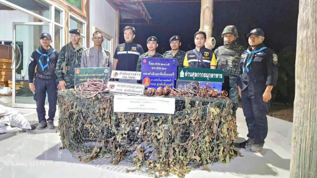 วันที่ 23 กุมภาพันธ์ 2568 ที่ผ่านมา กองร้อยหมวดสกัดกั้นฯที่ 1 กองกำลังสุรศักดิ์มนตรี ได้รับแจ้งจากแหล่งข่าวว่า จะมีการลักลอบขนสินค้าผ่านช่องทางธรรมชาติข้ามมายังฝั่งประเทศไทย จึงรายงานให้ผู้บังคับบัญชาทราบ และวางแผนทำการจับกุมร่วมกับกองร้อยทหารราบ และกองร้อยเฉพาะกิจทหารพรานที่ 2105 ออกตรวจในพื้นที่ หมู่ 2 บ.หว้านน้อย ต.หว้านใหญ่ อ.หว้านใหญ่ จ.มุกดาหาร พบเรือกีบเหล็กติดเครื่องยนต์แล่นจากฝั่ง สปป.ลาว เข้ามายังท่าน้ำฝั่งประเทศไทย และมองเห็นวัตถุต้องสงสัยเป็นกระสอบสีขาวจำนวนหลายใบอยู่ในเรือ เจ้าหน้าที่จึงได้แสดงตัวขอตรวจสอบสิ่งของภายในกระสอบพบว่าเป็นเศษโลหะที่ทำด้วยทองแดง รวมทั้งหมด 84 กระสอบ น้ำหนักประมาณ 3,000 กก. และแบตเตอรี่เก่า จำนวน 39 ลูก จึงได้ควบคุมตัวบุคคลที่อยู่ในเรือประกอบด้วยท้าว พิสะมอน พอนทิดา อายุ 43 ปี คนขับเรือ ท้าว ทะนะวัด สินนะสอน อายุ 18 ปี ท้าว เพดสะมัย สุพมมะวง อายุ 19 ปี อยู่บ้านบึงทะเล นะคอนไกสอนพมวิหาน แขวงสะหวันนะเขต สปป.ลาว โดยทั้ง 3 คนได้ยอมรับว่าได้ลักลอบขนสิ่งของดังกล่าวนำขึ้นเรือขนข้ามมาประเทศไทย เจ้าหน้าที่จึงได้ควบคุมตัวและตรวจยึดของกลางนำส่ง ตม.มุกดาหาร และด่านศุลกากรมุกดาหารดำเนินคดีตามกฎหมายต่อไป