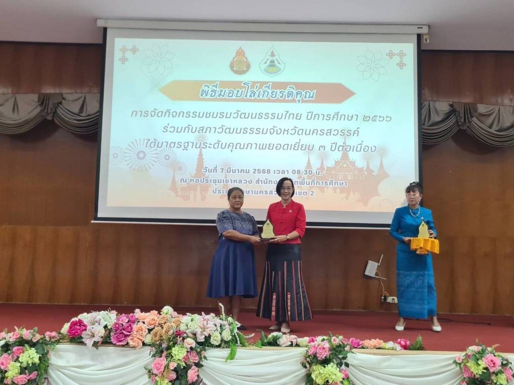 วันที่ 7 มีนาคม 2568 ณ หอประชุม สำนักงานเขตพื้นที่การศึกษา ประถมศึกษา นครสวรรค์ เขต 2 สภาวัฒนธรรมจังหวัด โดยนายพันศักดิ์ ศรีทอง ประธานสภาวัฒนธรรม และคณะกรรมการสภาวัฒนธรรมจังหวัดนครสวรรค์ เดินทางไปมอบโล่และเกียรติบัตรชมรมวัฒนธรรมในสถานศึกษา ของสถานศึกษาในสังกัด สพป.นว.เขต 2 โดยมีนางสาวญาณินท์ จิตตุรงค์อาภรณ์ ผอ.สพป.นว.2 เป็นประธาน ในพิธีมอบโล่และเกียรติบัตร ในการนี้มีสถานศึกษาได้รับโล่ผลงานยอดเยี่ยม 3 ปีซ้อน จำนวน 15 โรงเรียน ได้รับเกียรติบัตรผลงานยอดเยี่ยม จำนวน 55 โรงเรียน ผลงานดีเด่นจำนวน 4 โรงเรียนและผลงานดี จำนวน 6 โรงเรียน รวมทั้งสิ้น จำนวน 80โรงเรียน