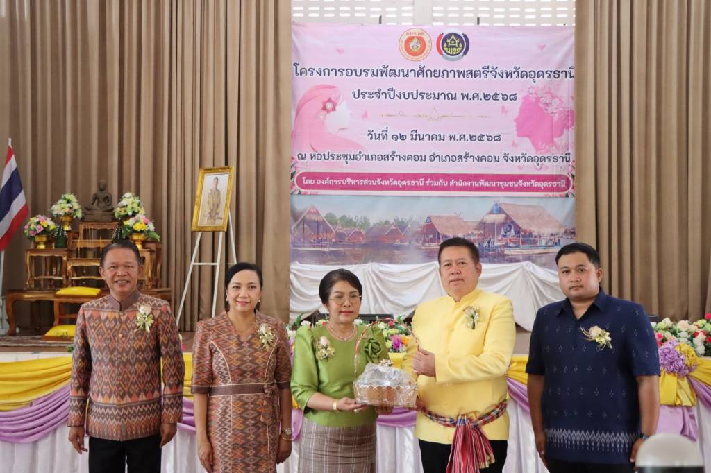 วันที่ 12 มีนาคม 2568 เวลา 10.00 น.นายศราวุธ เพชรพนมพร นายก อบจ.อุดรธานี มอบหมายให้ นายสมัคร บุญปก รองนายก อบจ.อุดรธานี พร้อม ข้าราชการ เจ้าหน้าที่ สำนักปลัด อบจ.อุดรธานี ร่วมเป็นเกียรติในงาน โครงการ "อบรมพัฒนาศักยภาพสตรี อ.สร้างคอม จ.อุดรธานี" เนื่องในวันสตรีสากล ประจำปี 2568 พร้อมพบปะ หัวหน้าส่วนราชการระดับอำเภอ คณะกรรมการพัฒนาสตรี อ.สร้างคอม กลุ่มสตรี ผู้นำท้องที่ ผู้นำท้องถิ่น และประชาชนในพื้นที่ กว่า 500 คน ณ หอประชุมที่ว่าการ อ.สร้างคอม จ.อุดรธานีโดยมี นายเอราวัณ รัตนเดชอุดม นอ.สร้างคอม (ประธานกล่าวเปิดงาน) นางดวงจิต รัตนเดชอุดม นายกกิ่งกาชาด อ.สร้างคอม นายเอกลักษณ์ โฆษิต ส.อบจ.อุดรธานี อ.สร้างคอม พร้อมภริยา นางเรือนแก้ว โภคาพานิชย์ ประธานคณะกรรมการพัฒนาสตรี อ.สร้างคอม (กล่าวรายงาน) ในปัจจุบัน สังคมไทย ถือได้ว่าสตรีไทย มีศักยภาพ มีความสามารถและเป็นที่ยอมรับโดยทั่วไป สตรียังเป็นแกนนำในการรณรงค์ การสร้างจิตสำนึกสาธารณะ สร้างความรัก ความสามัคคีในชุมชน เกื้อกูล มีน้ำใจ มีส่วนร่วมในการสร้างสรรค์ และพัฒนาสังคมไทย ให้อยู่เย็น เป็นสุข”