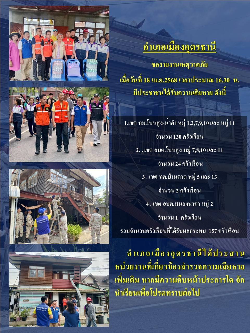 อำเภอเมืองอุดรธานีได้ประสานหน่วยงานที่เกี่ยวข้องสำรวจความเสียหายเพิ่มเติม หากมีความคืบหน้าประการใด จักนำเรียนเพื่อโปรดทราบต่อไป