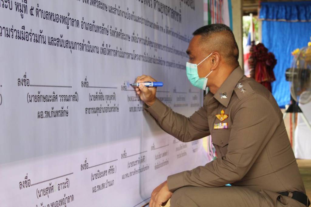 เมื่อวันที่ 1 ก.ย.64 ผู้สื่อข่าวรายงานว่า ที่ศาลาประชาคม บ้านกระบี่ หมู่ที่ 5 ต.หนองหญ้าลาด อ.กันทรลักษ์ จ.ศรีสะเกษ นายสุกิจ เหลืองสกุลไทย นายอำเภอกันทรลักษ์ ได้เดินทางไปเป็นประธานในพิธีเปิด โครงการดำเนินงานชุมชนยั่งยืน เพื่อแก้ไขปัญหายาเสพติด ตามยุทธศาสตร์ชาติแบบครบวงจร ซึ่ง สภ.กันทรลักษ์ ร่วมกับส่วนราชการที่เกี่ยวข้องได้จัดทำโครงการนี้ขึ้น โดยมี พ.ต.อ.นรินทร์ บุพตา ผกก.สภ.กันทรลักษ์ เป็นผู้กล่าวรายงานและมี พ.ต.ท.คณพศ ธนภูมิบุญญิน รอง ผกก.ป.สภ.กันทรลักษ์ พร้อมด้วย นางกันตพัชร์ ไชยนา นายกเทศมนตรีเทศบาลตำบลหนองหญ้าลาด ฝ่ายปกครอง สาธารณสุข ภาคีเครือข่าย ผู้นำท้องถิ่น และ ประชาชนบ้านกระบี่ หมู่ที่5 ข้าราชการตำรวจ ชุดชุมชนยั่งยืน สภ.กันทรลักษ์ ร่วมพิธีเปิดโครงการและให้การต้อนรับ