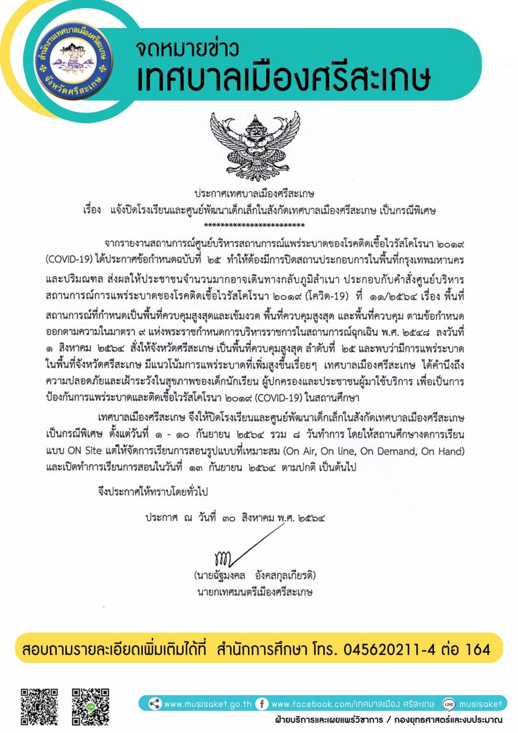 นายกเทศมนตรีเมืองศรีสะเกษ กล่าวต่อไปว่า เทศบาลเมืองศรีสะเกษ ได้คำนึงถึงความปลอดภัยและเฝ้าระวังในสุขภาพของเด็กนักเรียน ผู้ปกครองและประชาชนผู้มาใช้บริการ เพื่อเป็นการป้องกันการแพร่ระบาดและติดเชื้อไวรัสโคโรนา 2019 (COVID-19) ในสถานศึกษา เทศบาลเมืองศรีสะเกษ จึงให้ปิดโรงเรียนและศูนย์พัฒนาเด็กเล็กในสังกัดเทศบาลเมืองศรีสะเกษ เป็นกรณีพิเศษ ตั้งแต่วันที่ 1-10 ก.ย. 2564 รวม 8 วันทำการ โดยให้สถานศึกษางดการเรียนแบบ ON Site แต่ให้จัดการเรียนการสอนรูปแบบที่เหมาะสม (On Air, On line, On Demand, On Hand)และเปิดทำการเรียนการสอนในวันที่ 13 ก.ย.2564 ตามปกติ เป็นต้นไป ประกาศวันที่ 30 ส.ค.2564 สอบถามรายละเอียดเพิ่มเติมได้ที่ สำนักการศึกษา โทร. 045620211-4 ต่อ 164 //////////